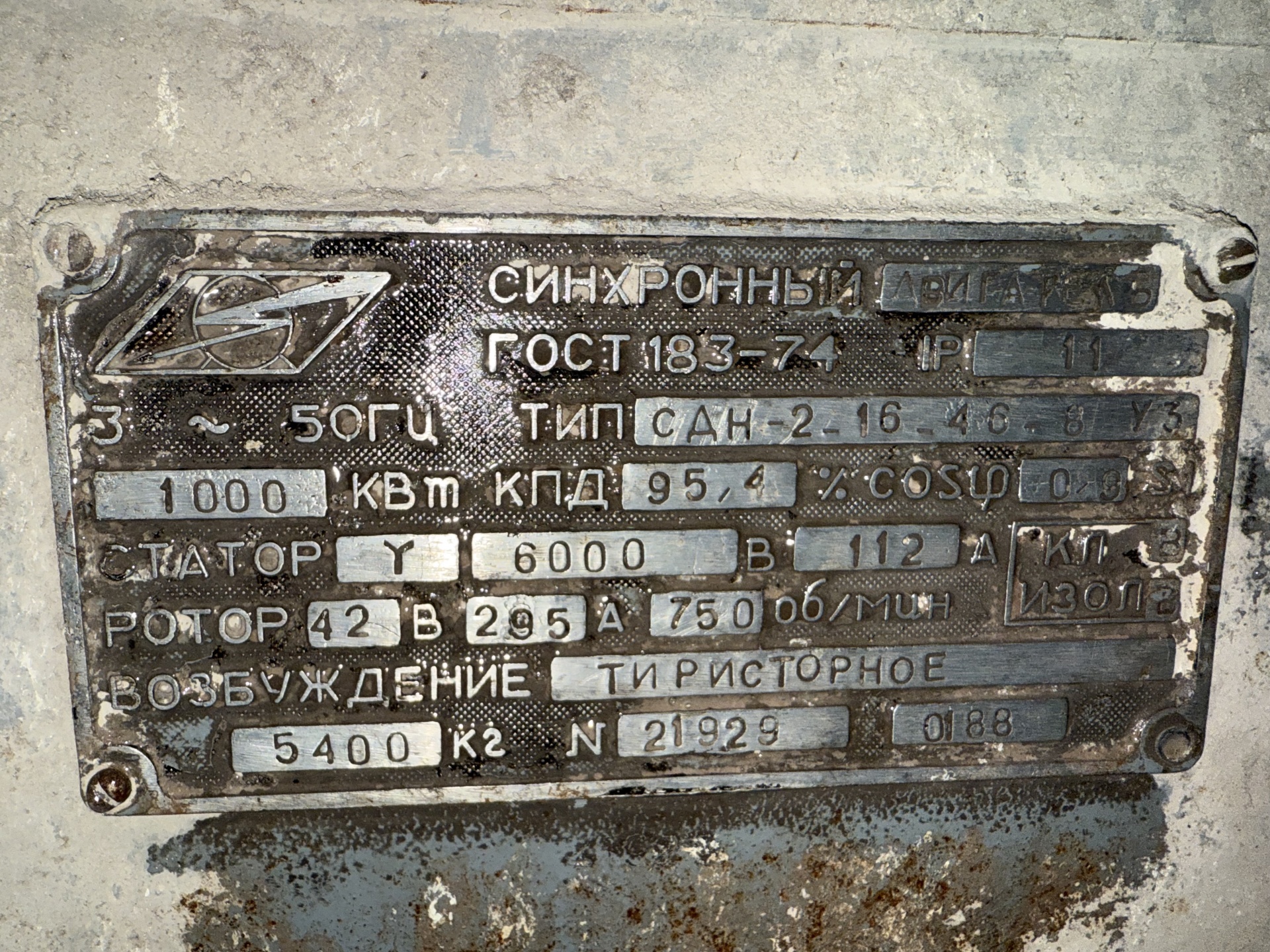 1000 кВт. 6000 Вольт. 750 об/мин.
