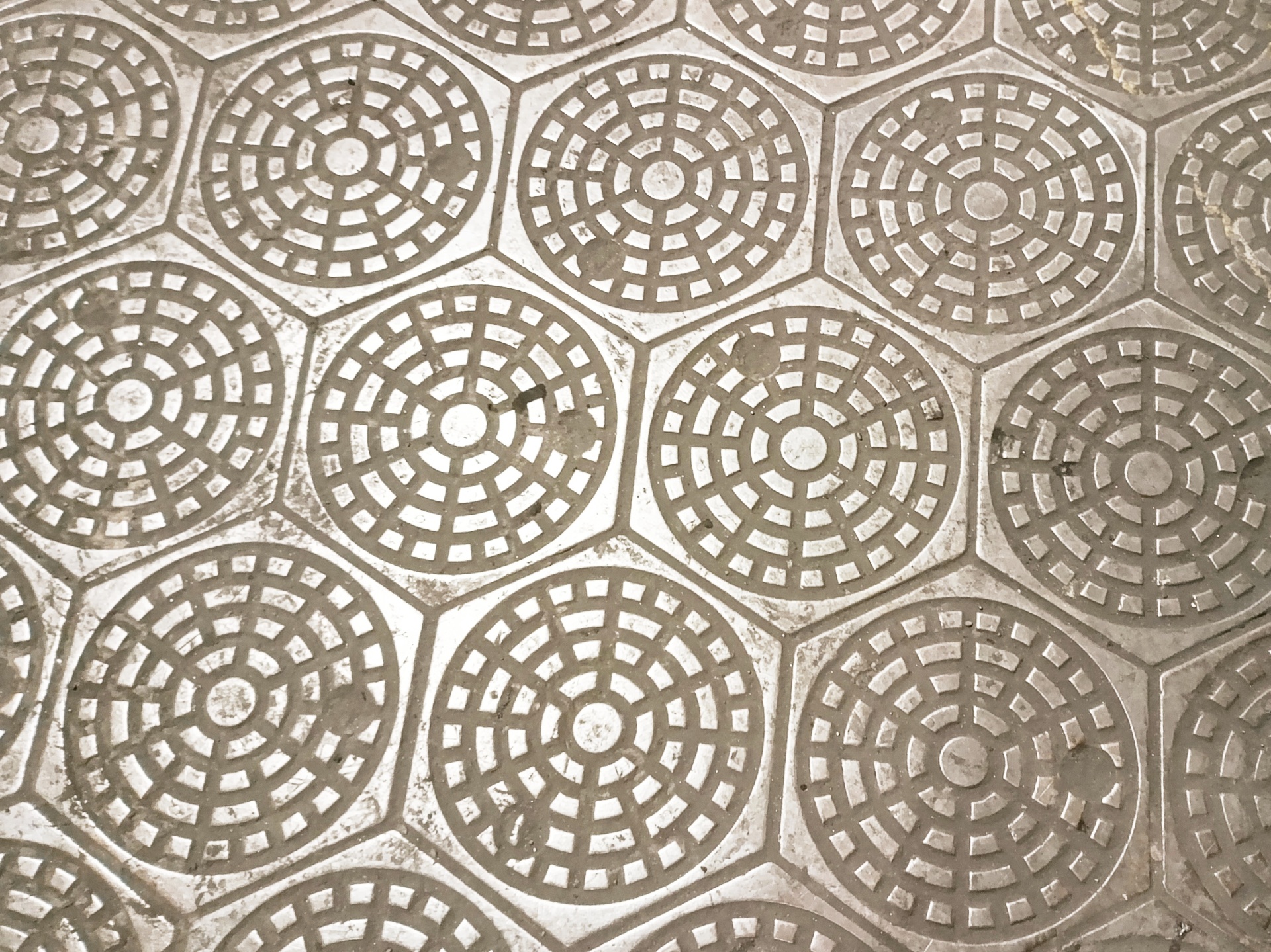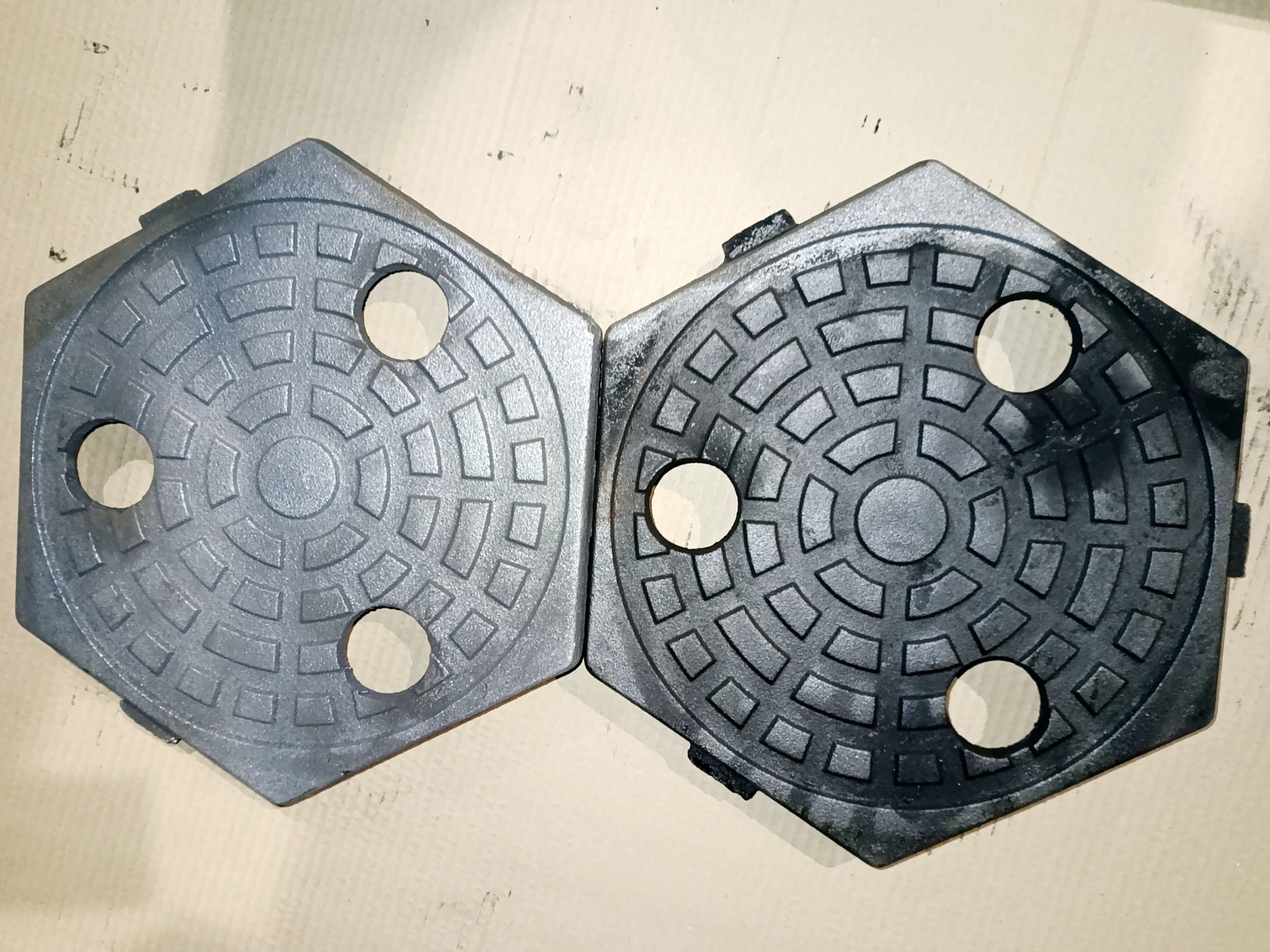 Плитка пола ПП-6Г Л7 (материал – серый чугун марки СЧ18) весом 11 кг имеет ромбообразную форму – шестигранник с шириной между параллельными сторонами равной 335 мм, имеющий 3 отверстия и 3 зацепа для позиционирования плитки относительно других плиток на одном уровне. Предназначена для быстрого монтажа необорудованного пола.