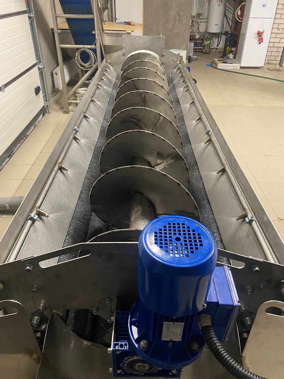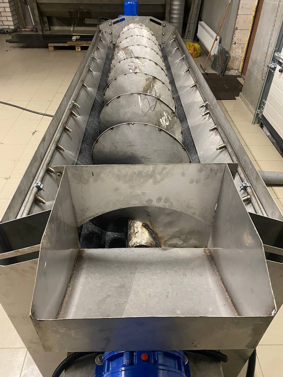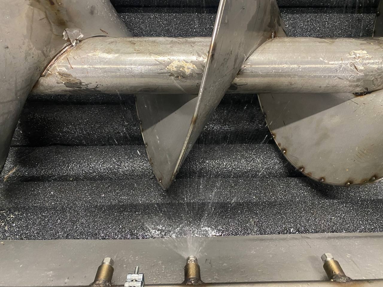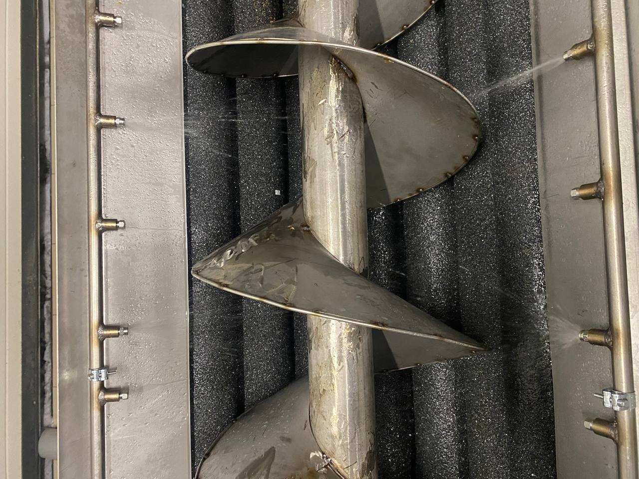 Машина поточной абразивной очистки. Активные валы, длиной 3 метра с возможностью регулировки скорости вращения, машина снабжена шнеком дозирования для управляемой равномерности подачи и управления степенью чистки. Регулируемая подача объёма воды.