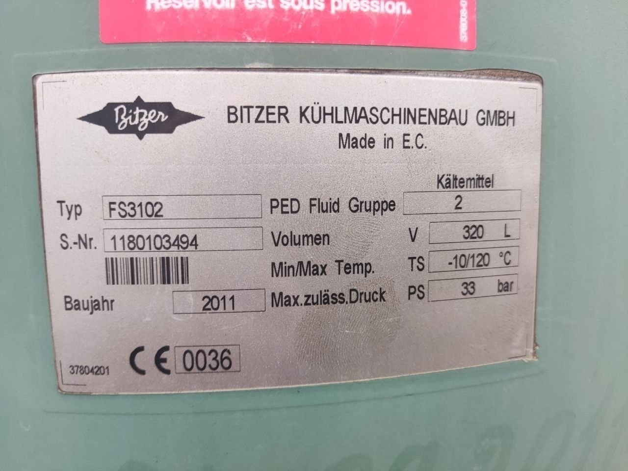 Ресивер 1: Bitzer FS 3102 (вертикальный, объем 320 литров, 33 бар).