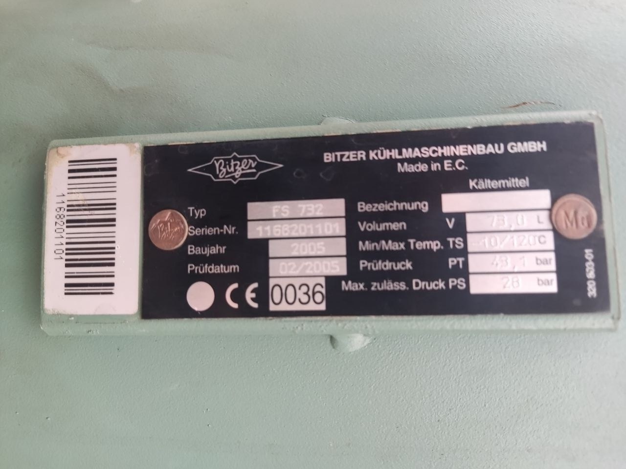 Ресивер 2: Bitzer FS 732 (горизонтальный, объем 73 литра, 28 бар).