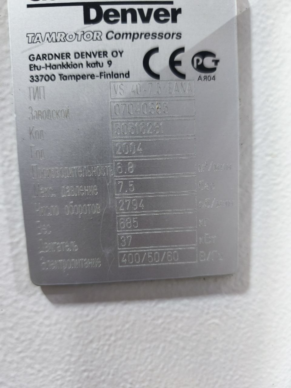 винтовой компрессор Tamrotor (Gardner Denver) модель VS 40-7.5 EANA Б/У - Продам в Смоленске