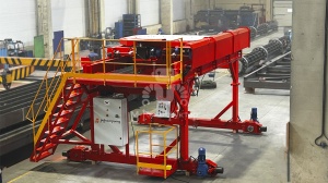 Рабочее место оператора – пост управления – расположено на силовой раме и представляет собой отдельную площадку, с которой осуществляется выполнение всех команд, заложенных в оборудование. Движение портала или тележки раздаточного бункера по порталу осуществляется при помощи джойстика, установленного на панели управления. Но, поскольку работа идёт на высоте, предусмотрена педаль оператора: пока она не нажата — ни портал, ни тележка не двинутся. Случайные перемещения полностью исключены.