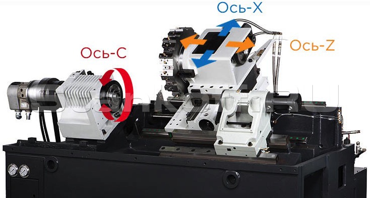 Шпиндель оснащён осью «С» и мощной револьверной головой с приводным инструментом. Такая компоновка позволяет использовать фрезерную функцию, с помощью приводных блоков. Производить фрезерование, осевое сверление и растачивание, нарезание резьбы и другие операции при обработке сложных технологических деталей.