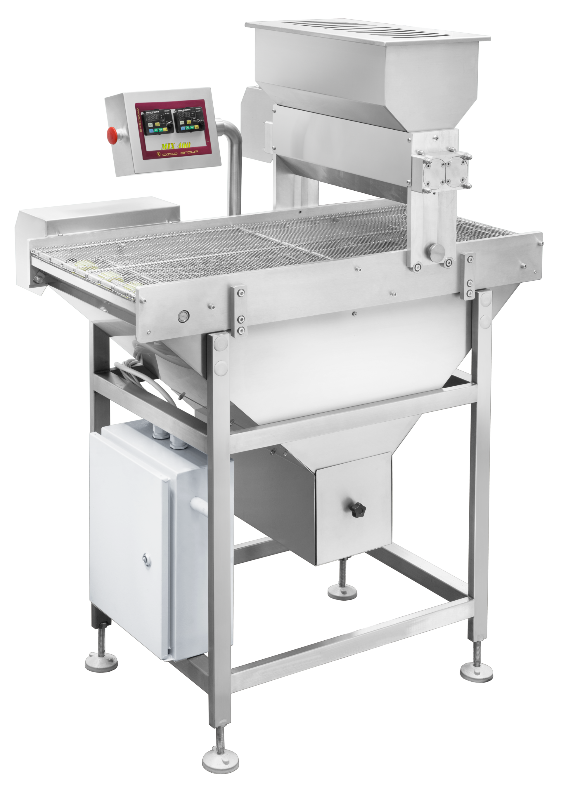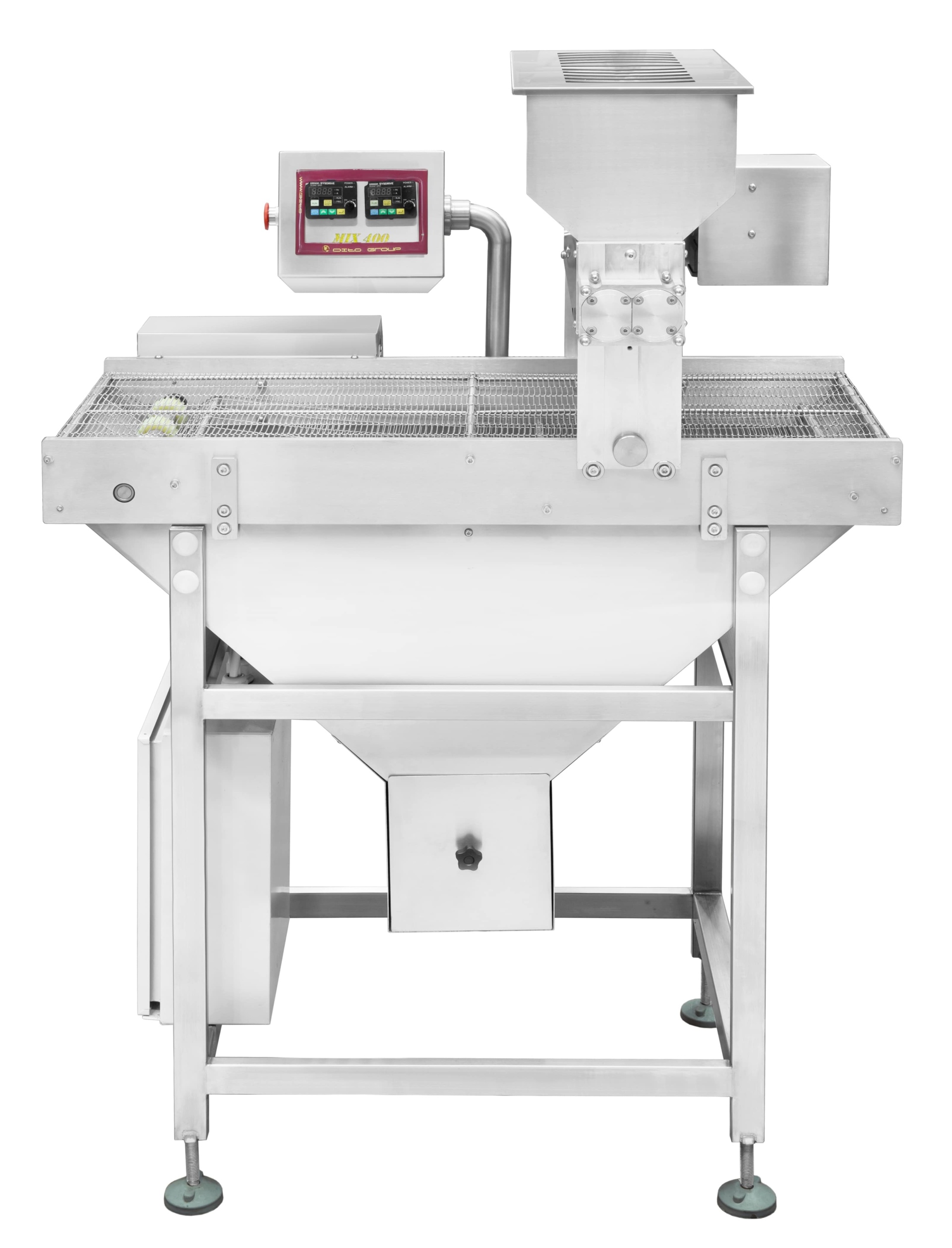 Система для обсыпки заготовок сахарной пудрой, сахаром, солью, кокосовой стружкой, шоколадной крошкой, кунжутом и прочими семенами, а также для поливки заготовок сахарным сиропом, меланжем, шоколадным сиропом и прочими сиропами. Конвейер может встраиваться в поточную линию или работать автономно, длина конвейера 1000 мм. Сетчатый конвейер комплектуется бункером для посыпки сверху.
