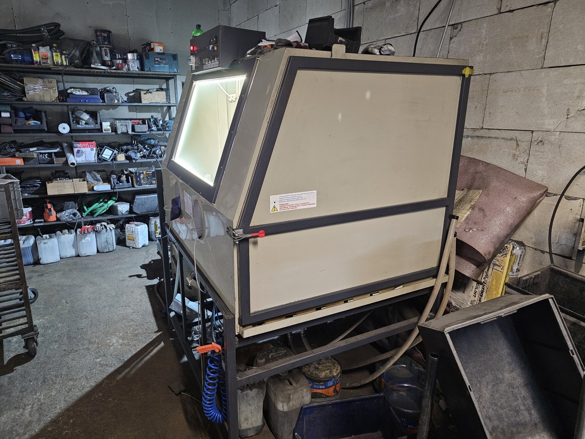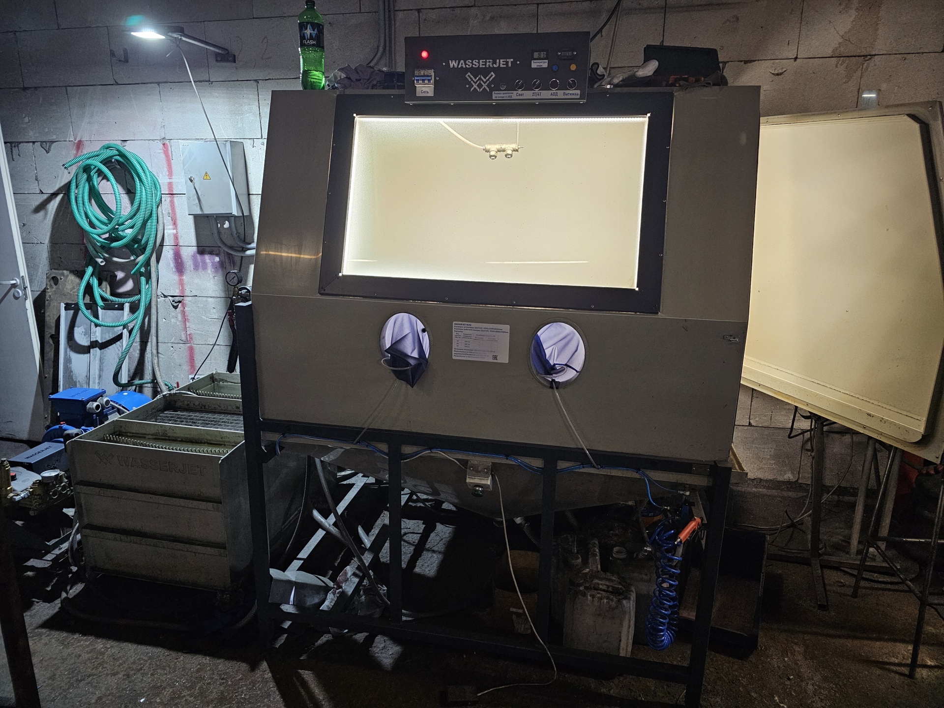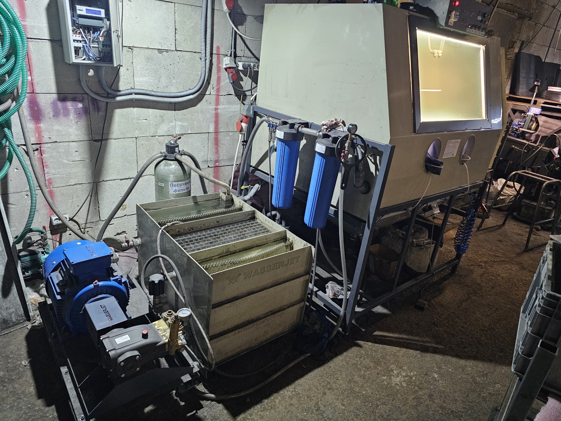 Добрый день! Продается установка аквабластинга 500 бар (на момент покупки самая мощная установка в Питере). В комплекте со станком идет 3 вида абразива: электрокорунд (ф36,ф26),нержавеющая колотая дробь 0,7мм (в бункере и на досып), "отстойник"-позволяет экономить воду (не подключая станок напрямую к водоснабжению), запасные перчатки, запасное стекло (новое), комплект фильтров тонкой очистки, вращающаяся подставка, "третья рука" (для закрепления пистолета стационарно), подача воздуха в перчатки.