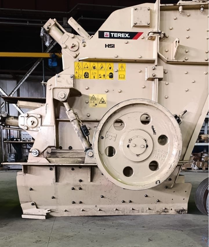 Роторная дробилка TEREX HSI 3434, новая с хранения. Устанавливается на мобильную дробилку TEREX XH250. Загрузочное окно 860 x 610 мм; Максимальный загружаемый кусок 500 мм; Максимальная настройка зазора (CSS) 120 мм на верхней плите, 55 мм на нижней плите; Минимальная настройка зазор (CSS) 40 мм на верхней плите, 20 мм на нижней плите; Производительность до 250 т/ч (Производительность зависит от установленного зазора (CSS) и свойств материала); Ширина ротора 860 мм; Диаметр ротора 860 мм; Ротор с 4-мя билами; Гидравлическая настройка зазора и удержания (CSS); Гидравлическая защита от перегрузки; Две отбойные плиты; Линейная скорость бил ротора 33-42 м/с; Смотровые окна для контроля износа бил; Резиновая и цепная завеса; Двурядные самоустанавливающиеся роликовые подшипники на каждом конце вала ротора; Электродвигатель 130 кВт, 50Гц, 1500 об/мин; Электропитание 380В, 3 фазы, 50 Гц; Вес дробилки 6400 кг
