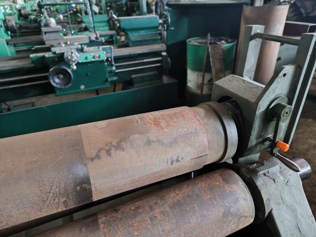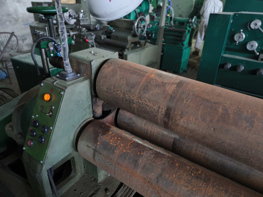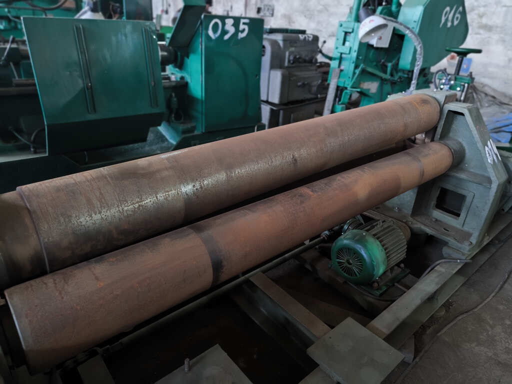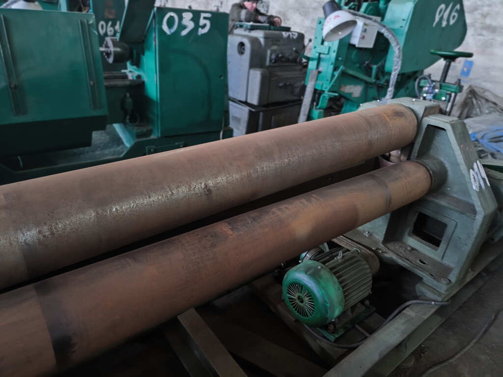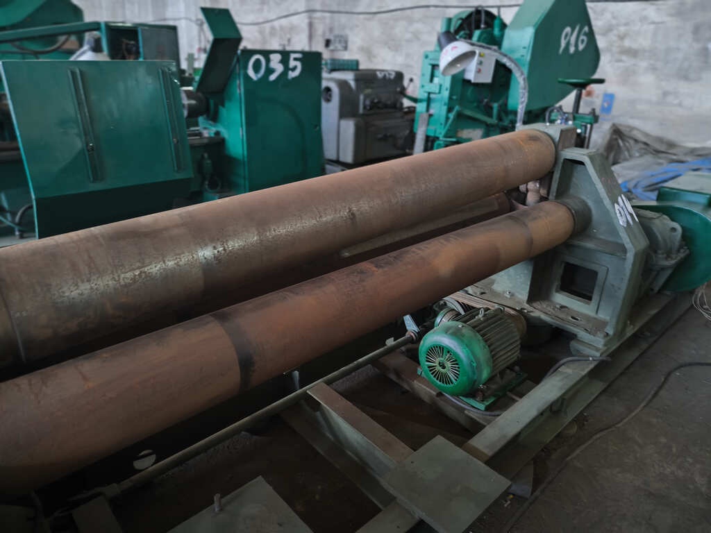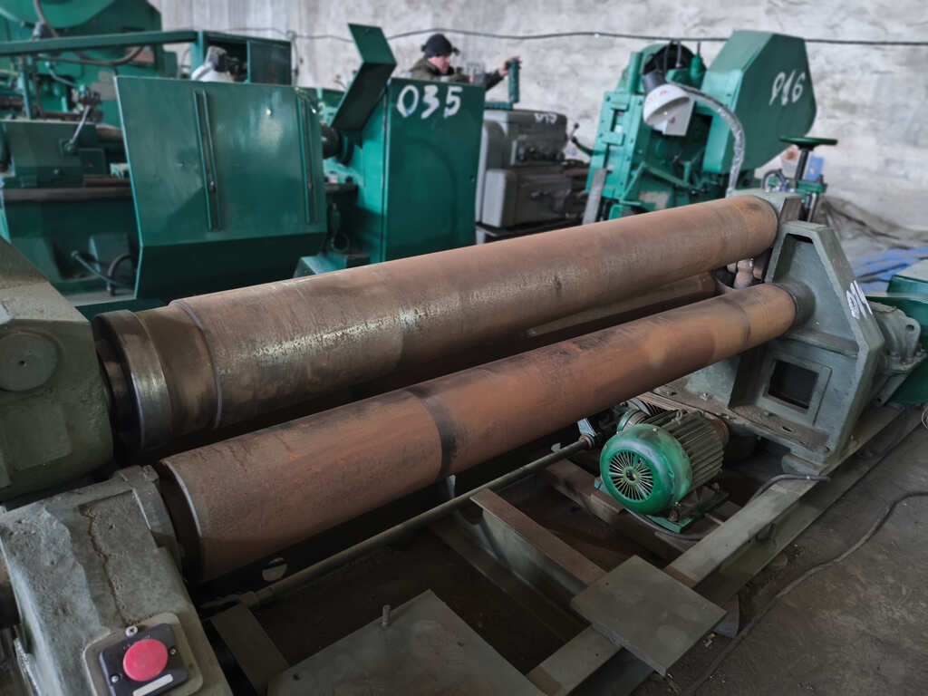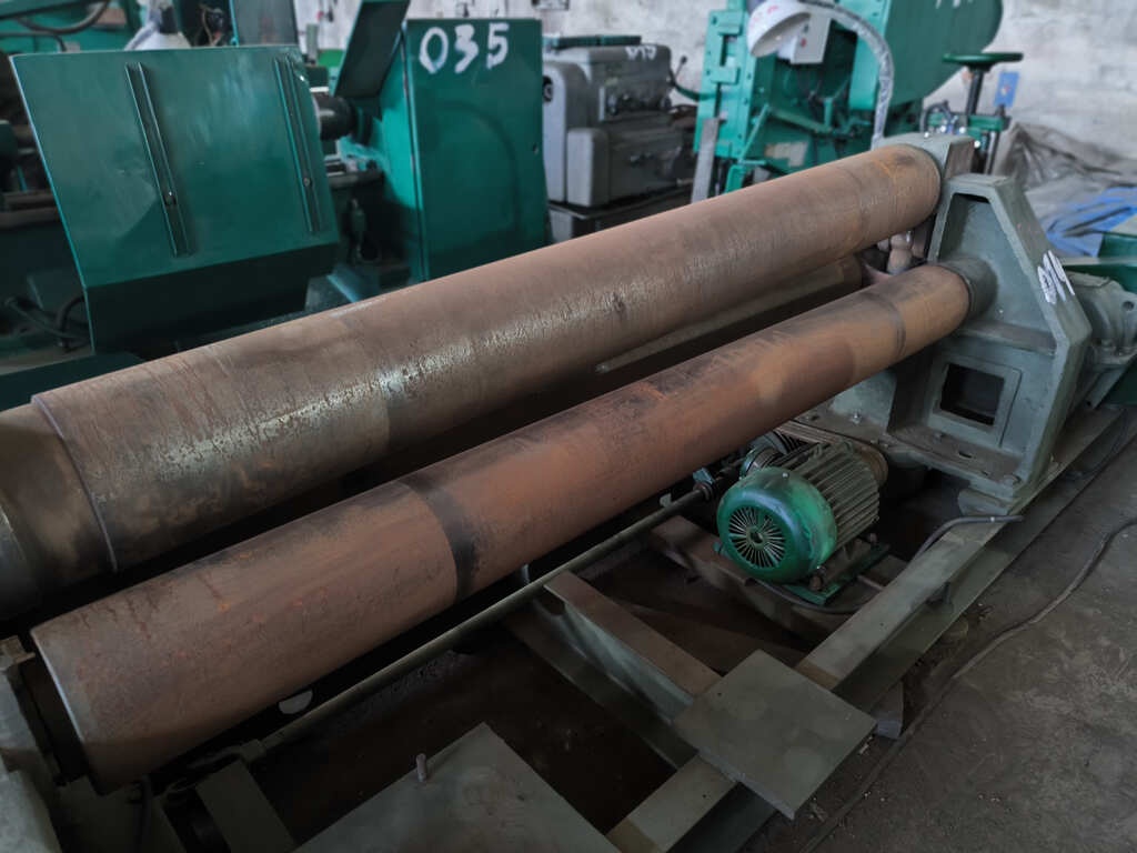 Вальцы 3-валковые И2220. Применяя универсальный листогибочную, можно согнуть листовой материал из углеродистой стали (предел текучести 250 Мпа) толщиной от до 10 мм, ширина заготовки максимум 2 м.