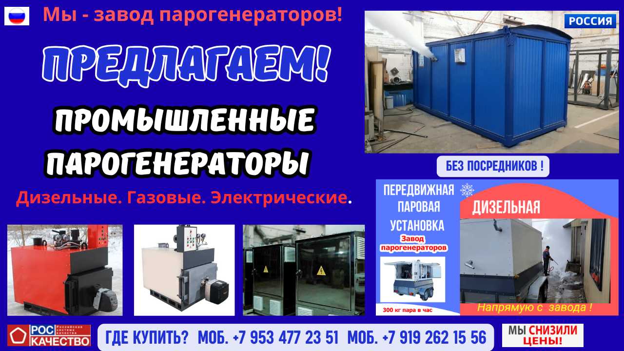 Наш завод - производит различные промышленные парогенераторы, в том числе: газовые, дизельные, электрические, мобильные и автономные стационарные парогенераторы.