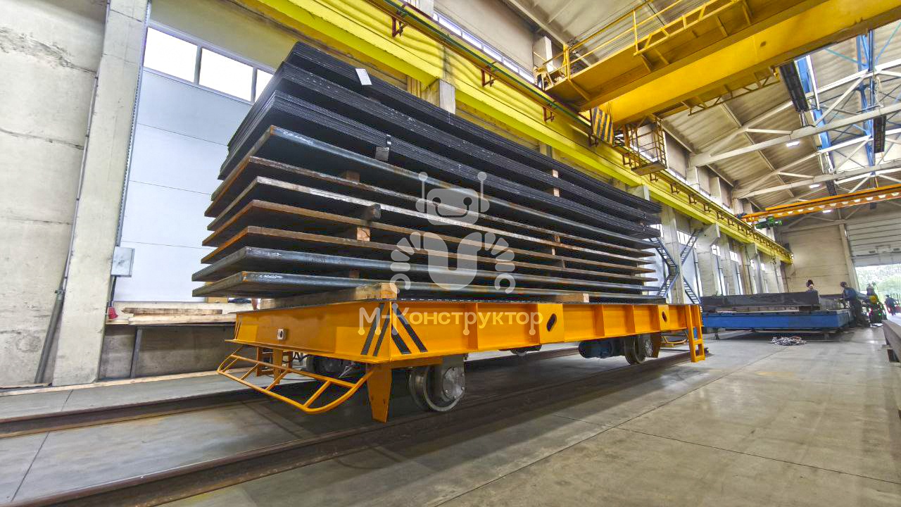 Конструкция тележки рассчитана на интенсивную эксплуатацию в условиях тяжелых промышленных нагрузок, обеспечивая стабильную работу в рамках комплексных производственных циклов. Несущая рама из листового и фасонного проката служит прочной основой для всех узлов: ведущих и ведомых колёс, мотор-редукторов, электрооборудования и защитных элементов.
