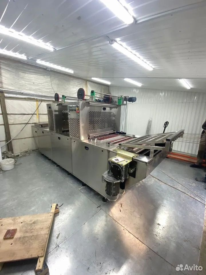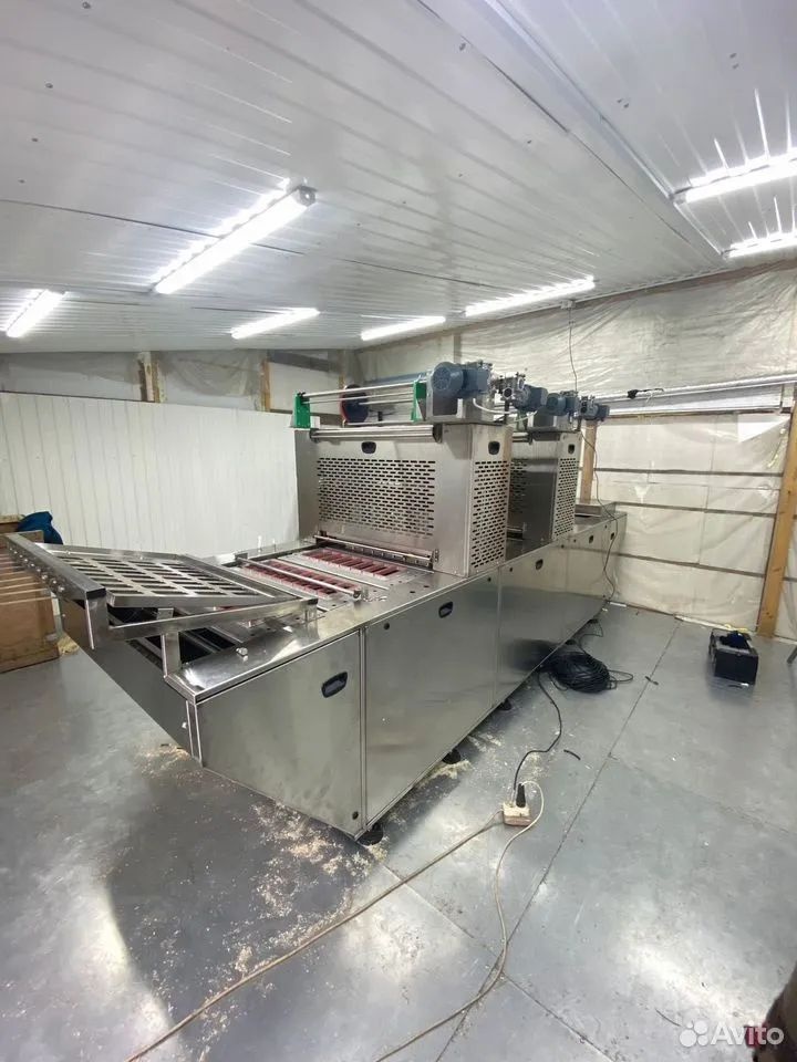 Запайщик конвейерный гусеничного типа с тремя режимами запайки: простая запайка, запайка под вакуумом; запайка вакуум-газ. Два вакуумных насоса по 100 м3. Два запаянных блока по восемь гнезд под лоток 180х80 мм (сэндвич)