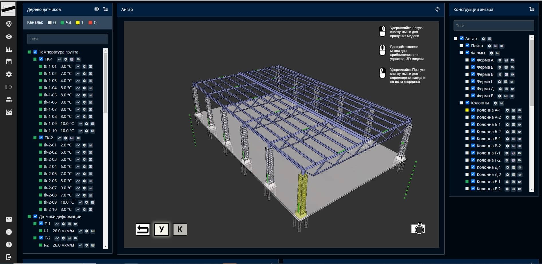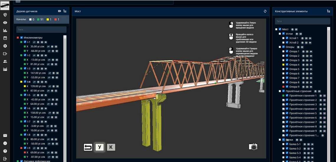 - 3D-визуализация объекта мониторинга и установленных на них датчиков, дефектов объекта мониторинга