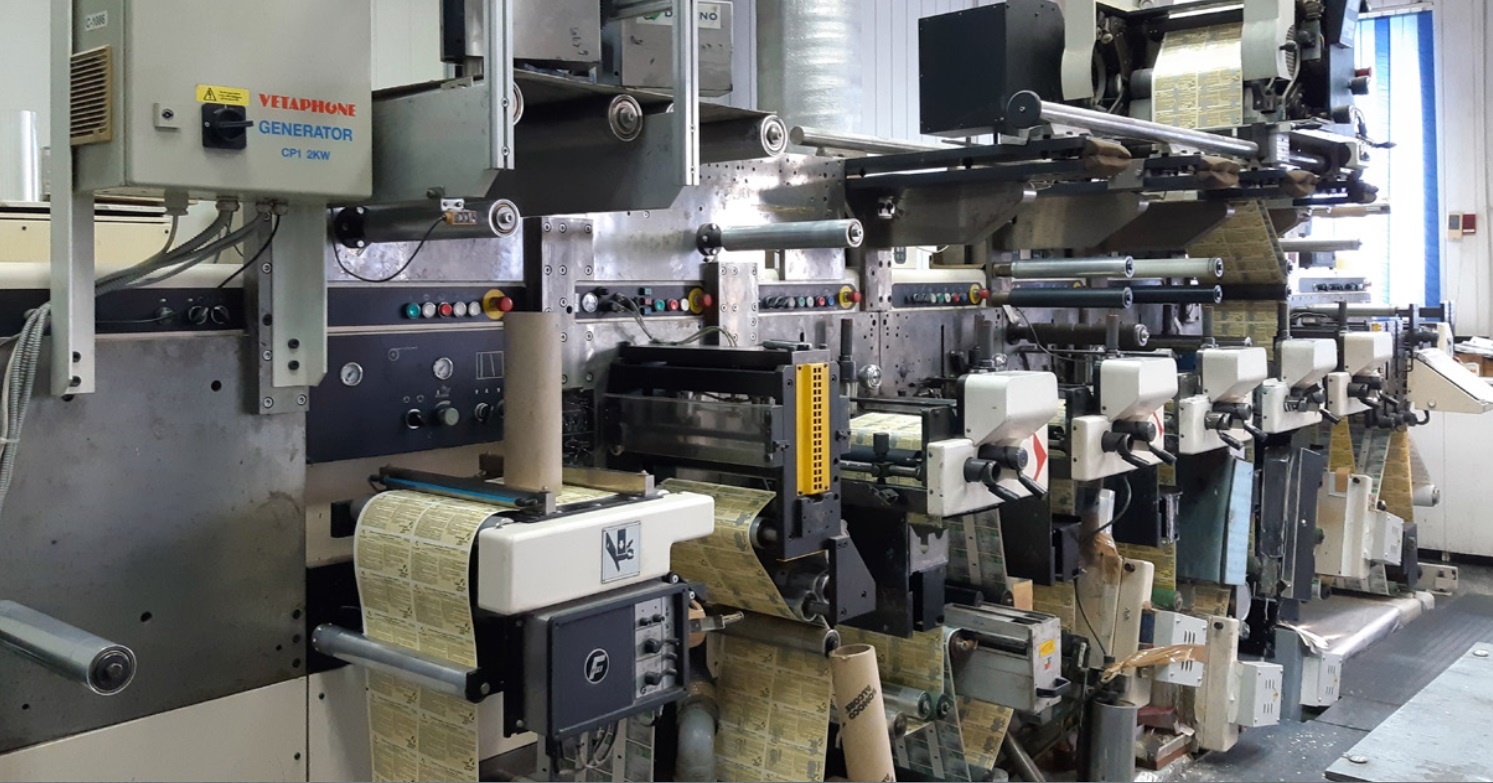 Высокоскоростная флексографская печатная машина с подачей кромки, высечкой, склеиванием и обвязкой