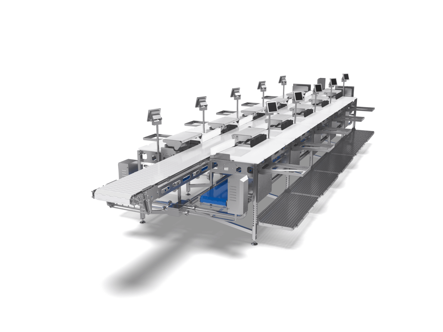 Использование цифровых технологий в конструкции линии обвалки и порционирования JWE обеспечивает точный мониторинг производственных операций в актуальном времени. Это особенно важно в сфере пищевого производства, где необходимо соблюдать строгие стандарты безопасности, гигиены и учитывать множество факторов, оказывающих влияние на качество готовой продукции. Инновационная линия обвалки и порционирования JWE способствует экономии ресурсов предприятия и создаёт предпосылки для производства продукции премиального качества. Стандартная комплектация рассчитана на обслуживание 10 рабочих позиций (по 5 по обеим сторонам конвейера).