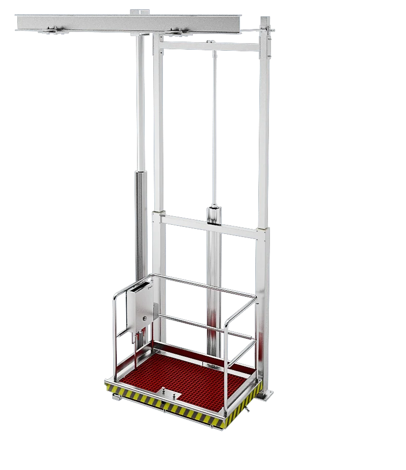 Пневматическая подъемная платформа предназначена для поднятия одного сотрудника на нужную высоту для проведения различных производственных задач, таких как обработка туш, перемещаемых по конвейеру. Изготовленная из нержавеющей стали, применяемой в пищевой промышленности, конструкция обеспечивает поддержание необходимого уровня чистоты в рабочей среде.