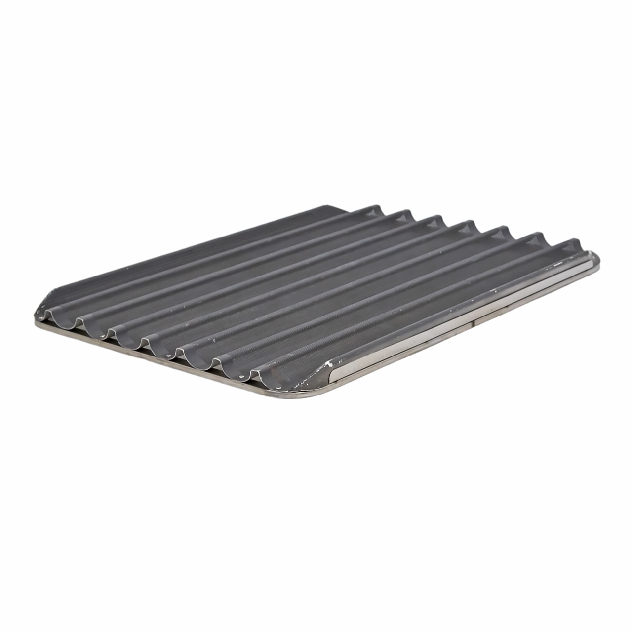 Противень алюминиевый перфорированный для багетов 600х800, 8 волн используется на предприятиях общественного питания и торговли, в пекарнях и кондитерских.