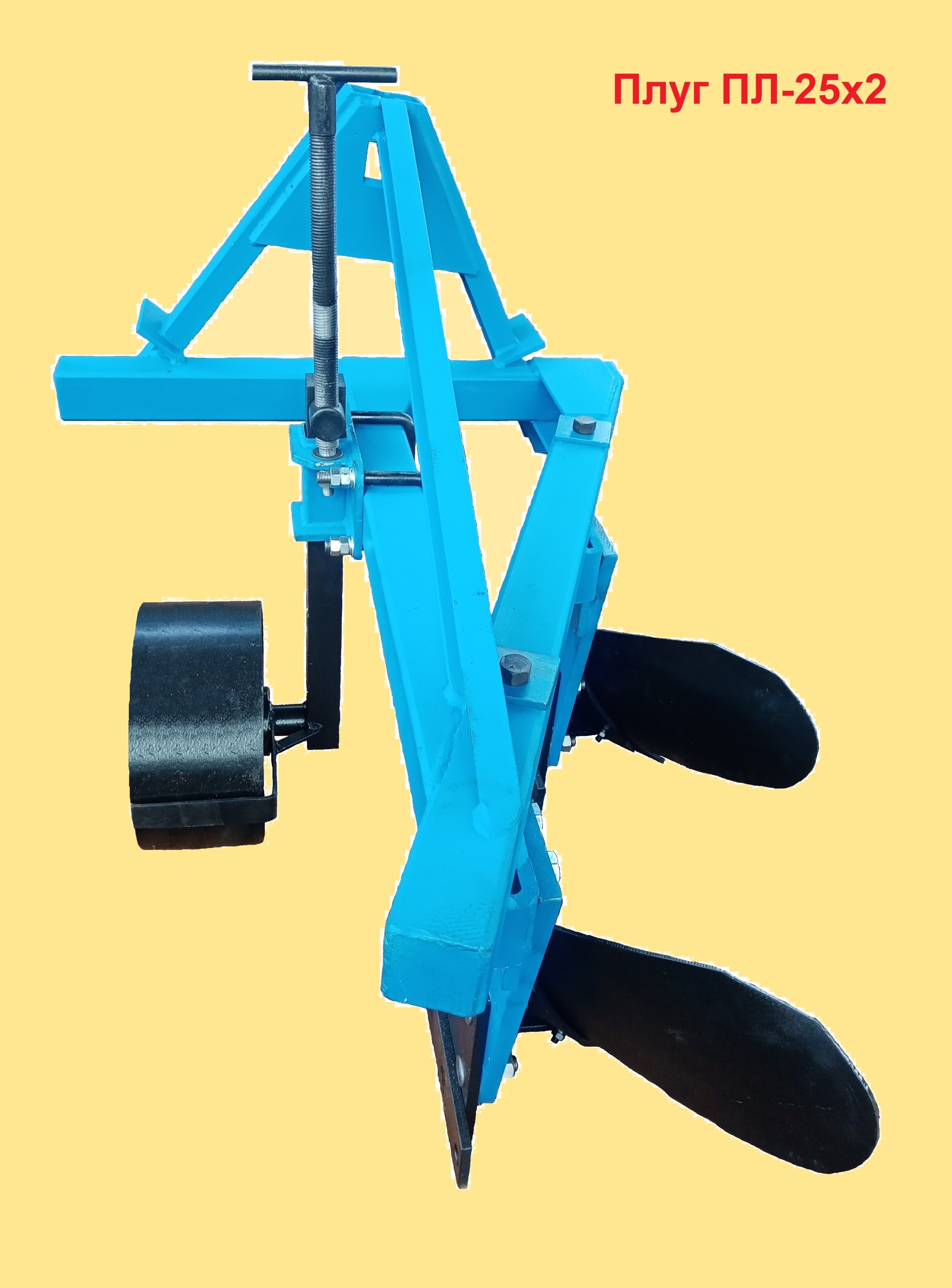 Мощный надежный двухкорпусный плуг с захватом 25 см на один корпус (общий захват 50 см). Вес плуга 210 кг. Навеска на три точки или на треугольник. Срок службы 20 лет.