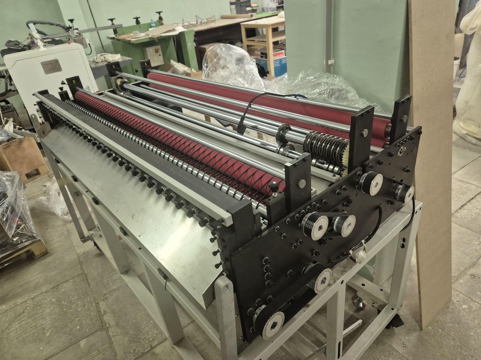 Станок продольно-поперечной резки рулонных материалов. Ширина 1600 мм. Переплетные материалы. Дисковые ножи. Мин ширина резки 15 мм. С рулона в лист.Диаметр рулона 300 мм.