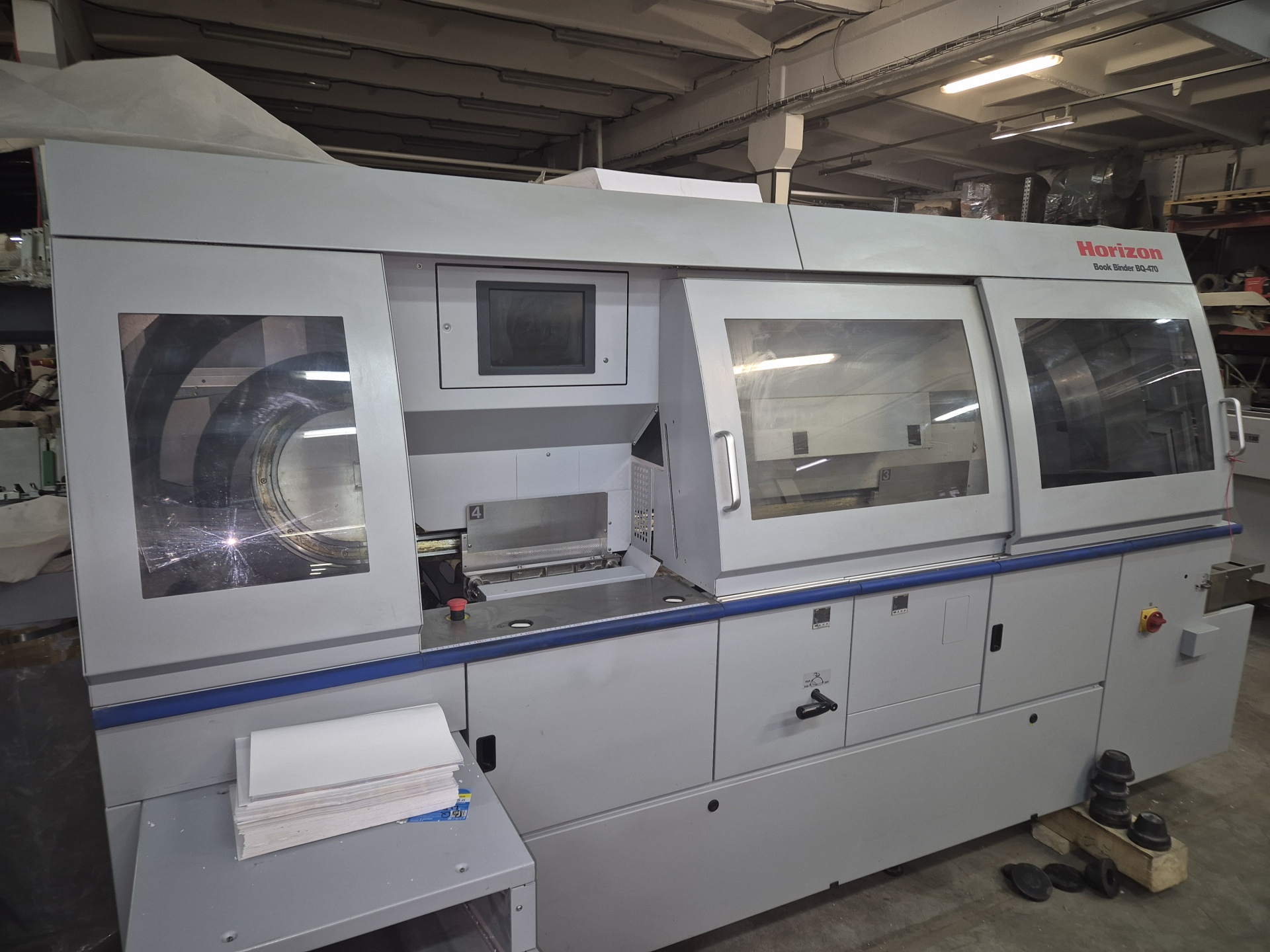 Horizon BQ-470 – профессиональная установка бесшвейного скрепления с полностью автоматической настройкой параметров по размерам готового блока. Horizon BQ-470, 4 каретки, горячий клей, боковая промазка: