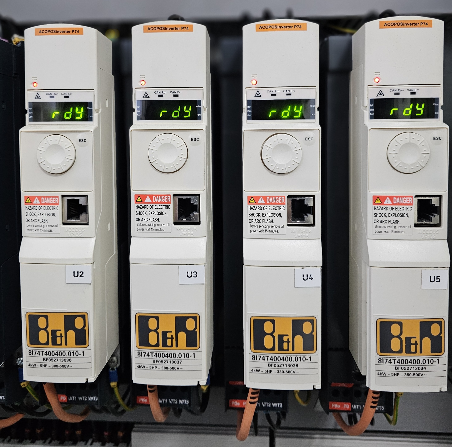 В наличии полный комплект: промышленный компьютер B&R Panel PC 2100 5AP923.1215-00, 5 частотных преобразователей B&R 8I74T400400.010-1, 4 блока B&R 8I0IF108.400-1для связи частотного преобразователя и компьютера, контроллер шины B&R X20BC0083, 6 соединительных кабелей B&R X20CA0E61.00300.