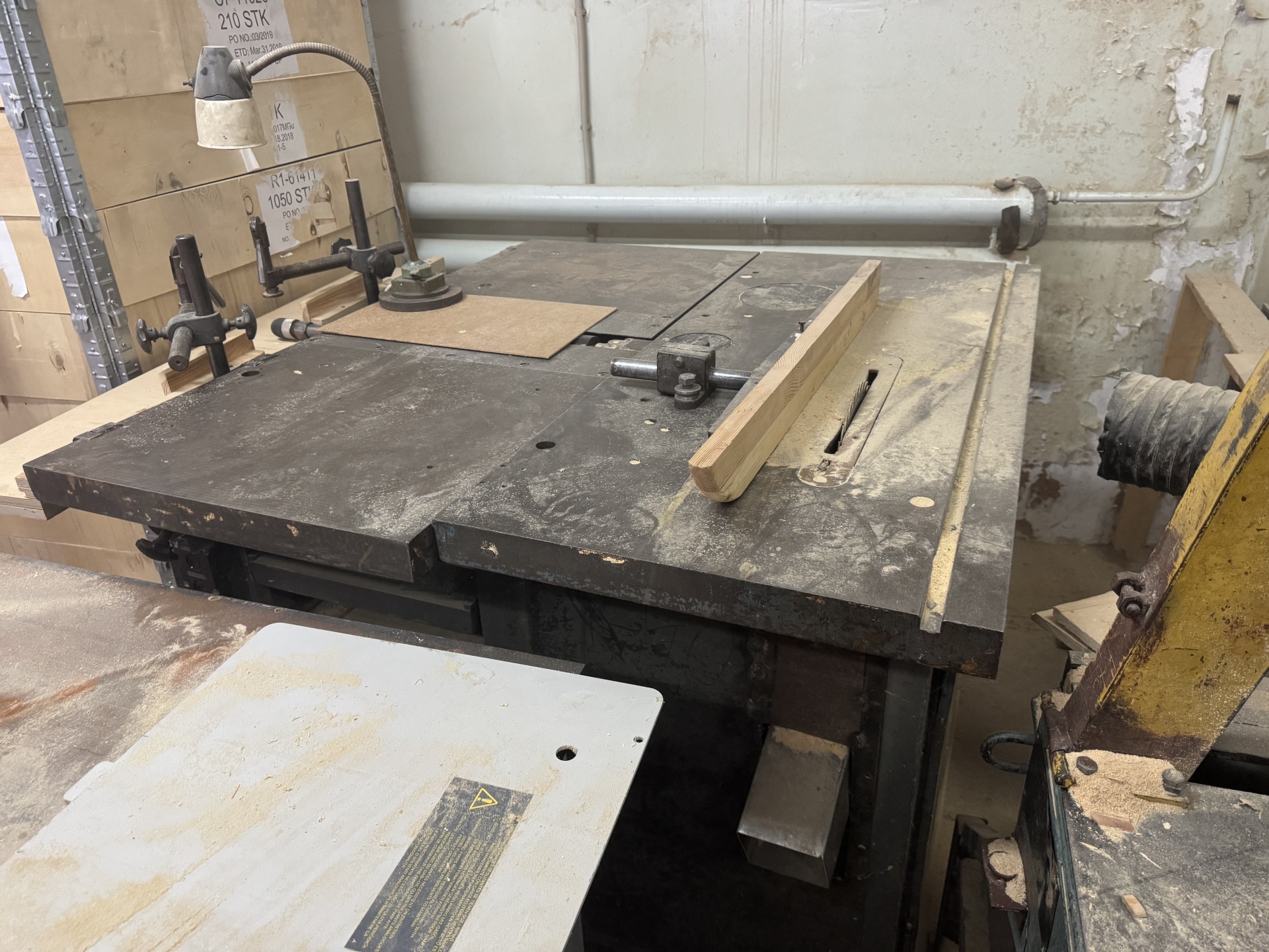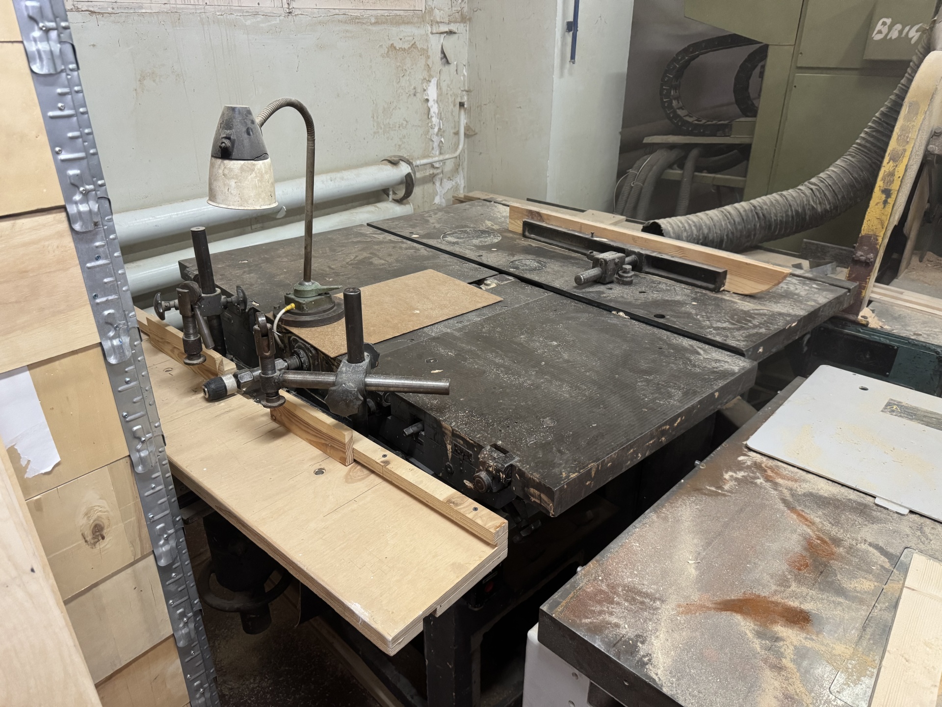 Уникальный и мощный станок предназначен для выполнения продольного и поперечного пиления, распиловки под углом, торцовки, строгания и рейсмусования, проходного фрезерования, сверления-пазования, нарезки шипов и заточки фуговальных ножей. Состоит из двух модулей (станин): пильно-фрезерный модуль и фуговально-рейсмусный–сверлильный-пазовально-заточной модуль. Станок имеет составную виброустойчивую станину коробчатой формы. Пильный стол имеет неподвижное крепление. Сверлильно-пазовальный стол откидывается и имеет фиксатор. Столы для фугования имеют коробчатую форму. Данные фуговальные столы установлены на кронштейнах станины и размещаются над ножевым валом. При выполнении операции рейсмусования столы откидывают, а в рабочем положении фиксируют с помощью эксцентриковыми зажимами. Для настройки станка на требуемую глубину фугования просто изменяют высоту переднего стола. На станине в шарикоподшипниковых опорах размещается ножевой вал. При помощи винтов и клиньев в корпусе закреплены 2 ножа, которые позволяют достаточно легко и плавно отрегулировать высоту ножей. В одном из концов ножевого вала имеется коническое отверстие для установки патрона, с помощью которого крепятся фреза или сверло. Станок в хорошем и рабочем состоянии!