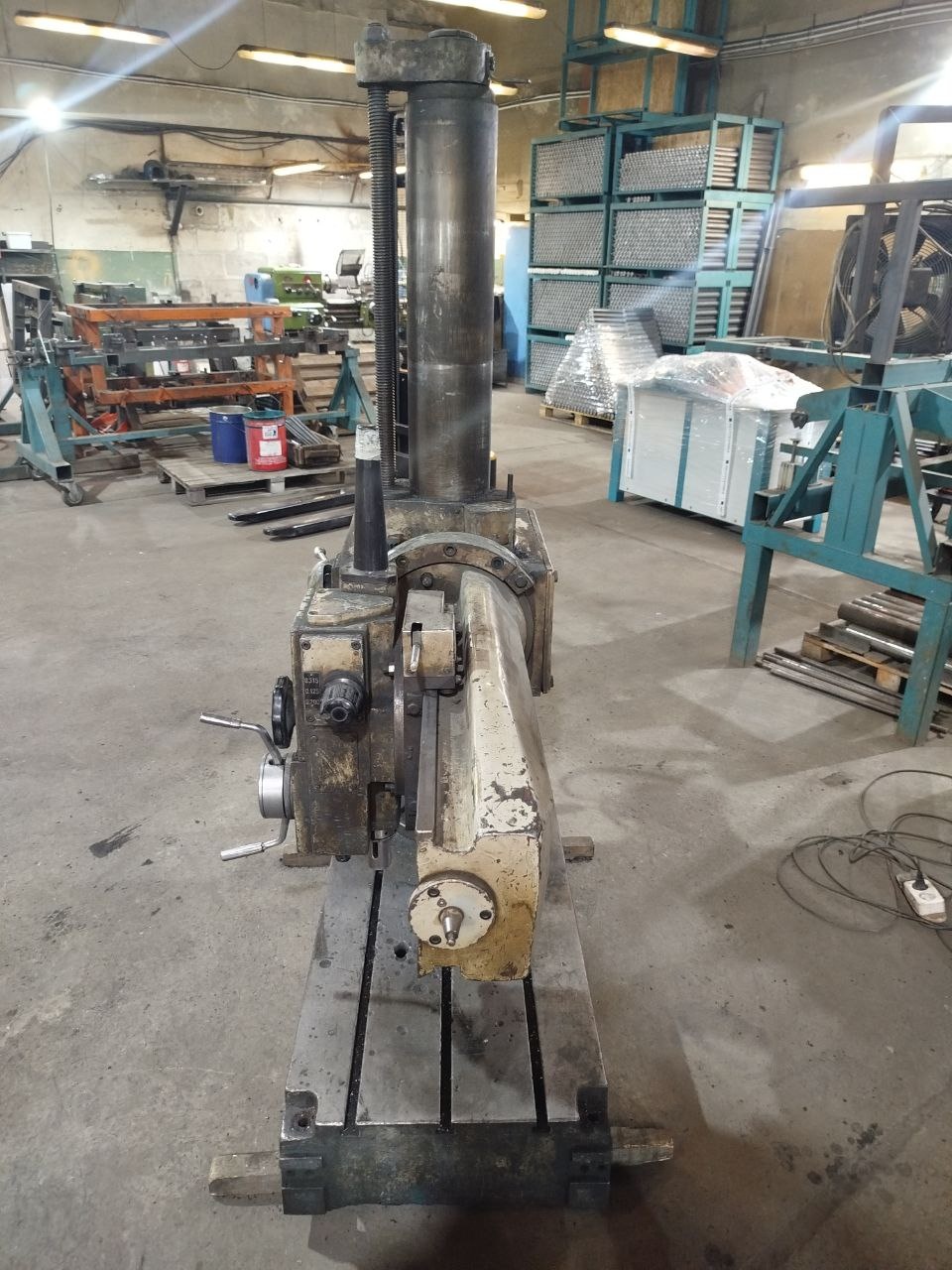 Станок рассчитан на сверление и расточку отверстий в стальных заготовках, нарезание резьбы и раззенковку. Можно обрабатывать как мелкие детали на плите, так и крупногабаритные узлы без перетаскивания самой детали — рукав поворачивается и выдвигается.