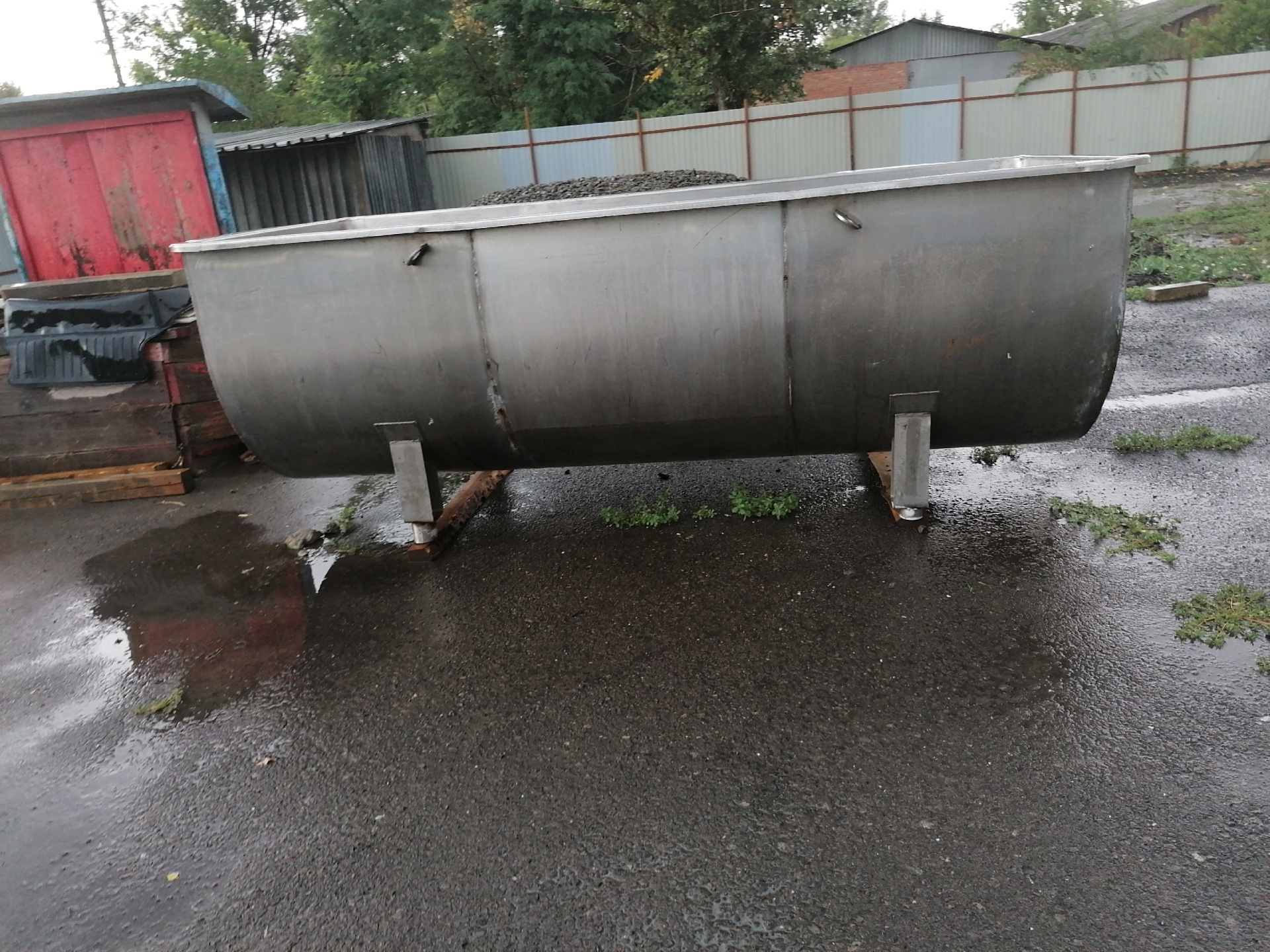 Емкость из нержавеющей сталис внутренним и наружным корпусом(водяная рубашка), объём - 2500л; кран; патрубок контрольный; патрубок сливной; патрубок наполнения. Диаметр проходного отверстия шиберного крана 120мм; габариты: длина 3050мм, ширина 1380мм, высота 1070мм, масса не более 425кг.