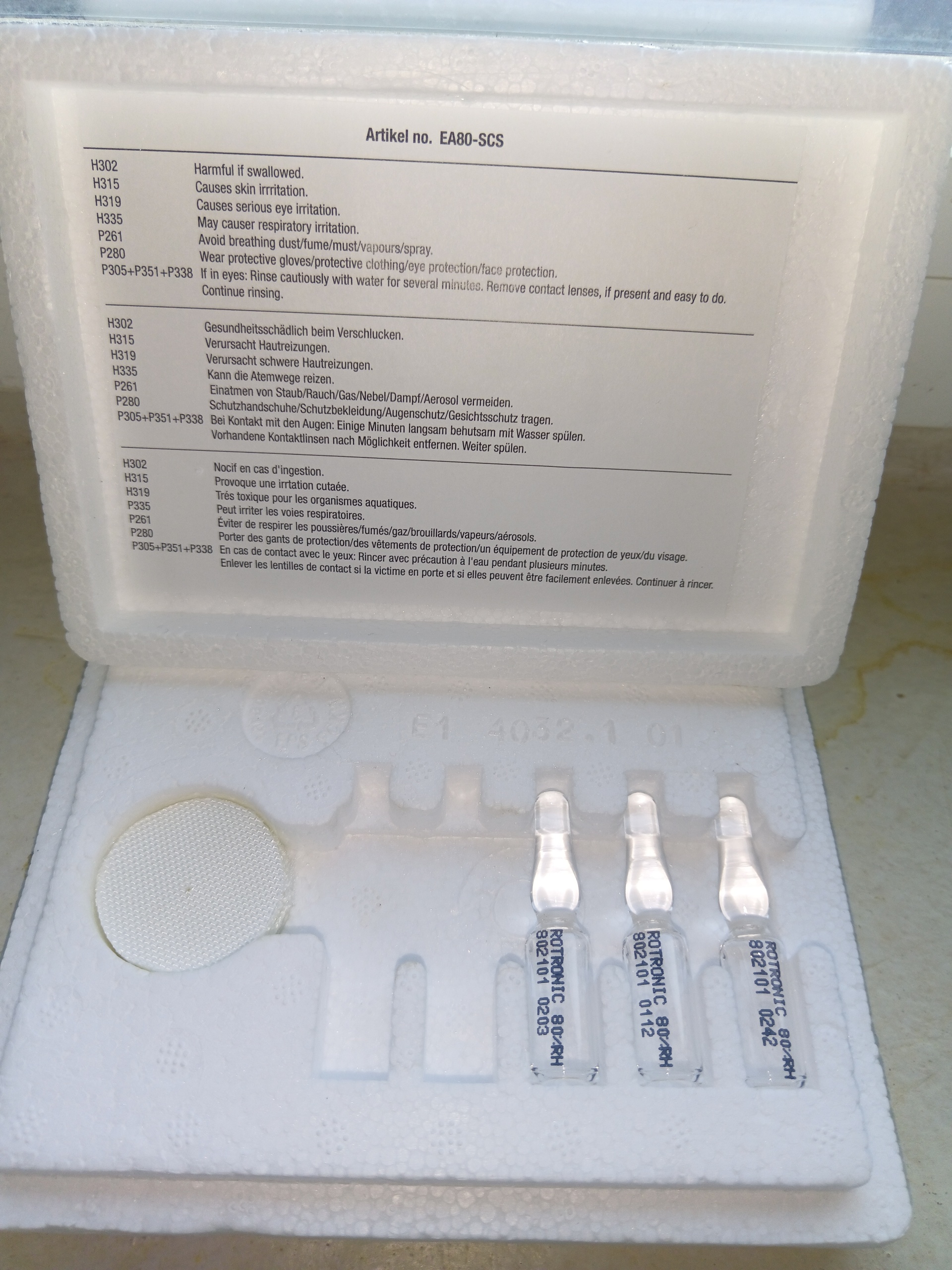 Rotronic EA80-SCS — это набор из трёх ампул ненасыщенного солевого раствора хлорида лития с концентрацией 80% относительной влажности, используемых для калибровки датчиков влажности на месте.
