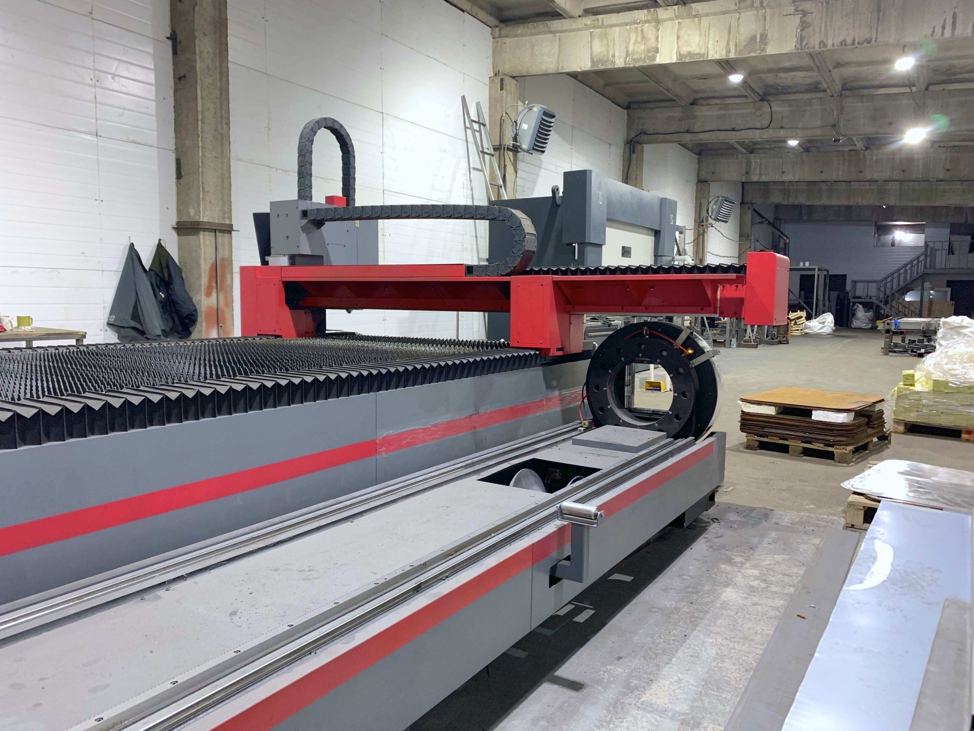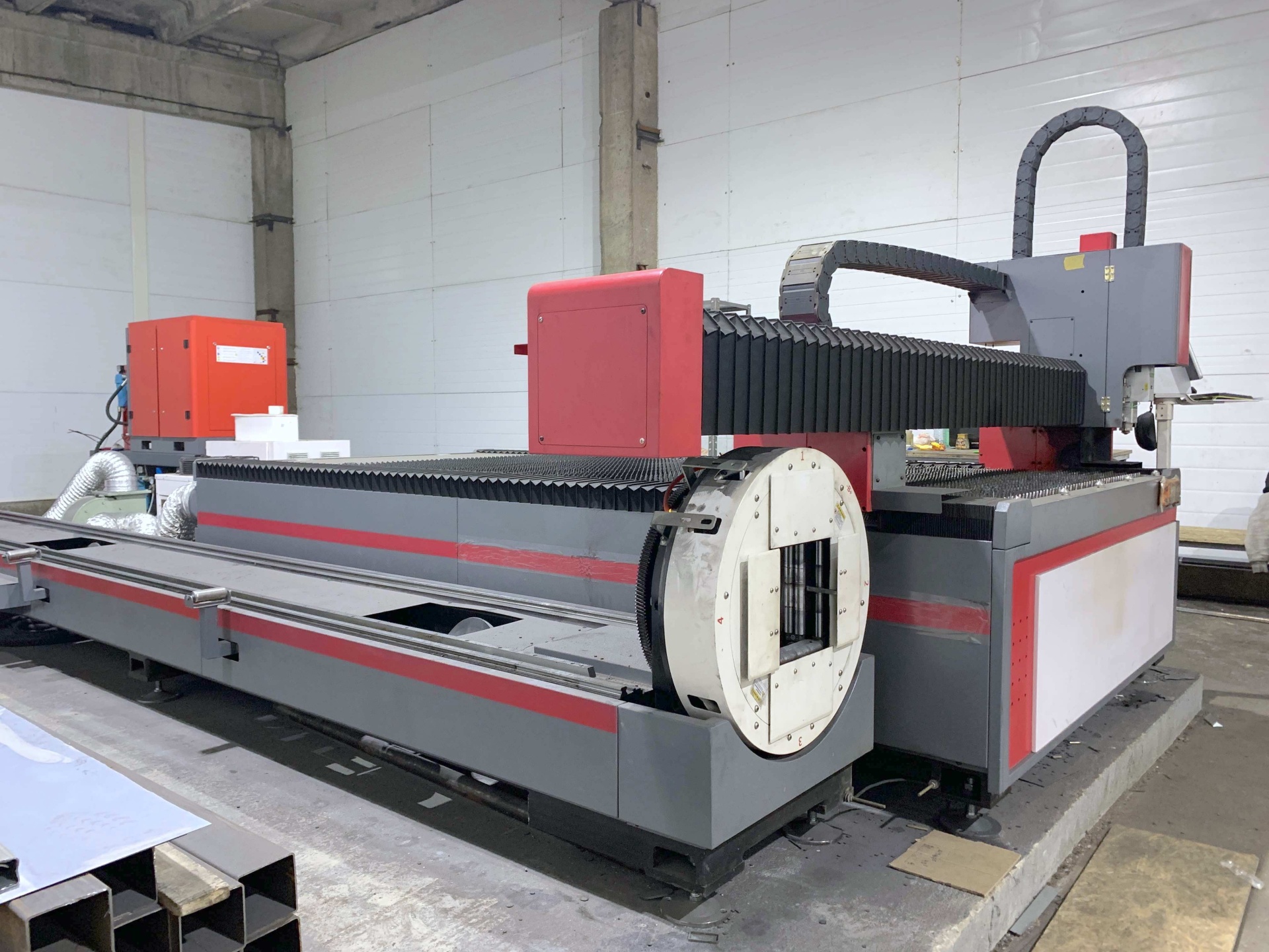 Установка имеет дополнительный модуль обработки круглых и профильных труб длиной до 6 м.