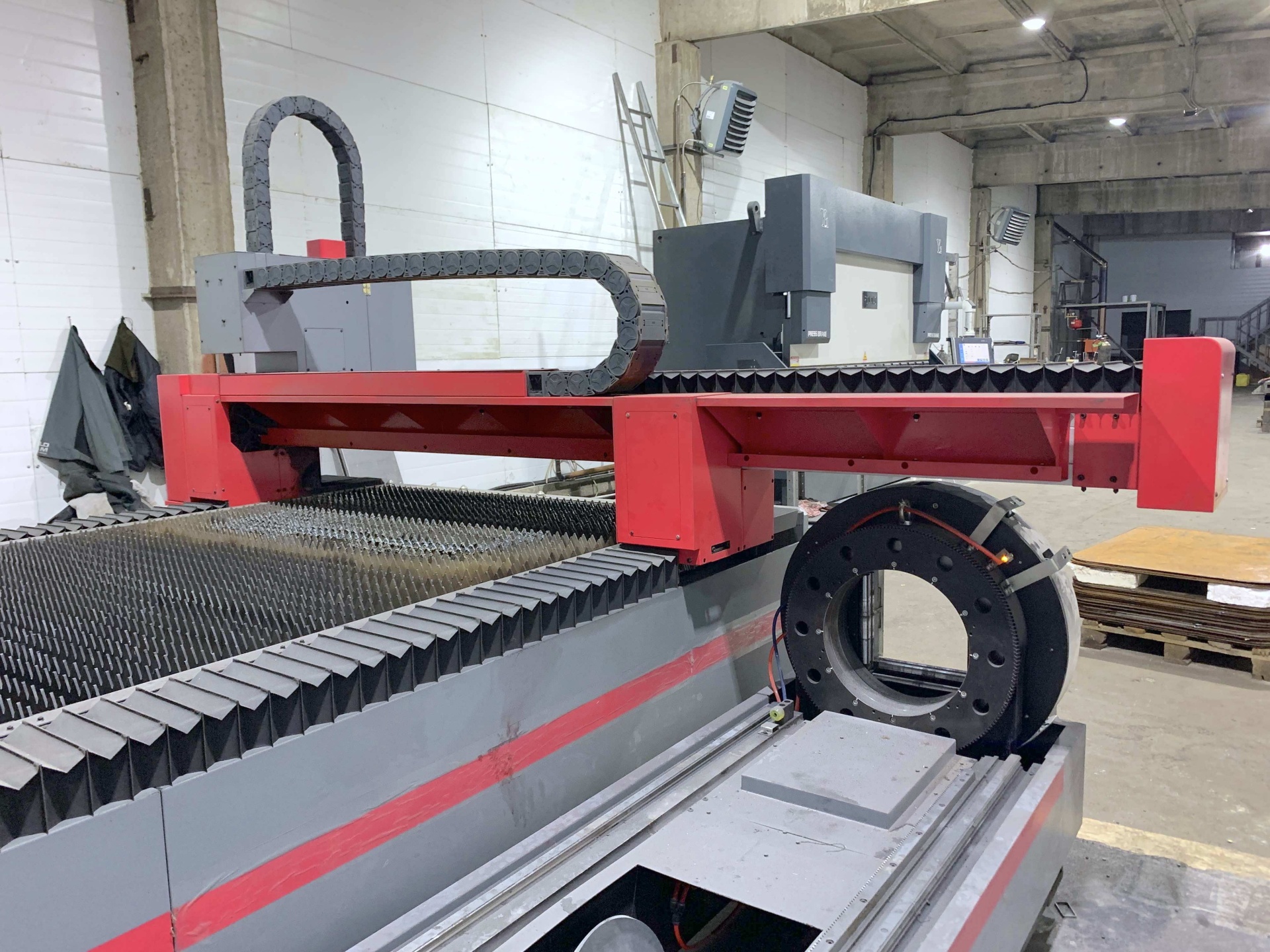 Универсальная машина для обработки листового и трубного проката. Мощность 3 кВт. Скорость до 120 м/мин. Зона резки 3 х 1,5 м. Длина трубы до 6 м. Диаметр трубы до 220 мм.