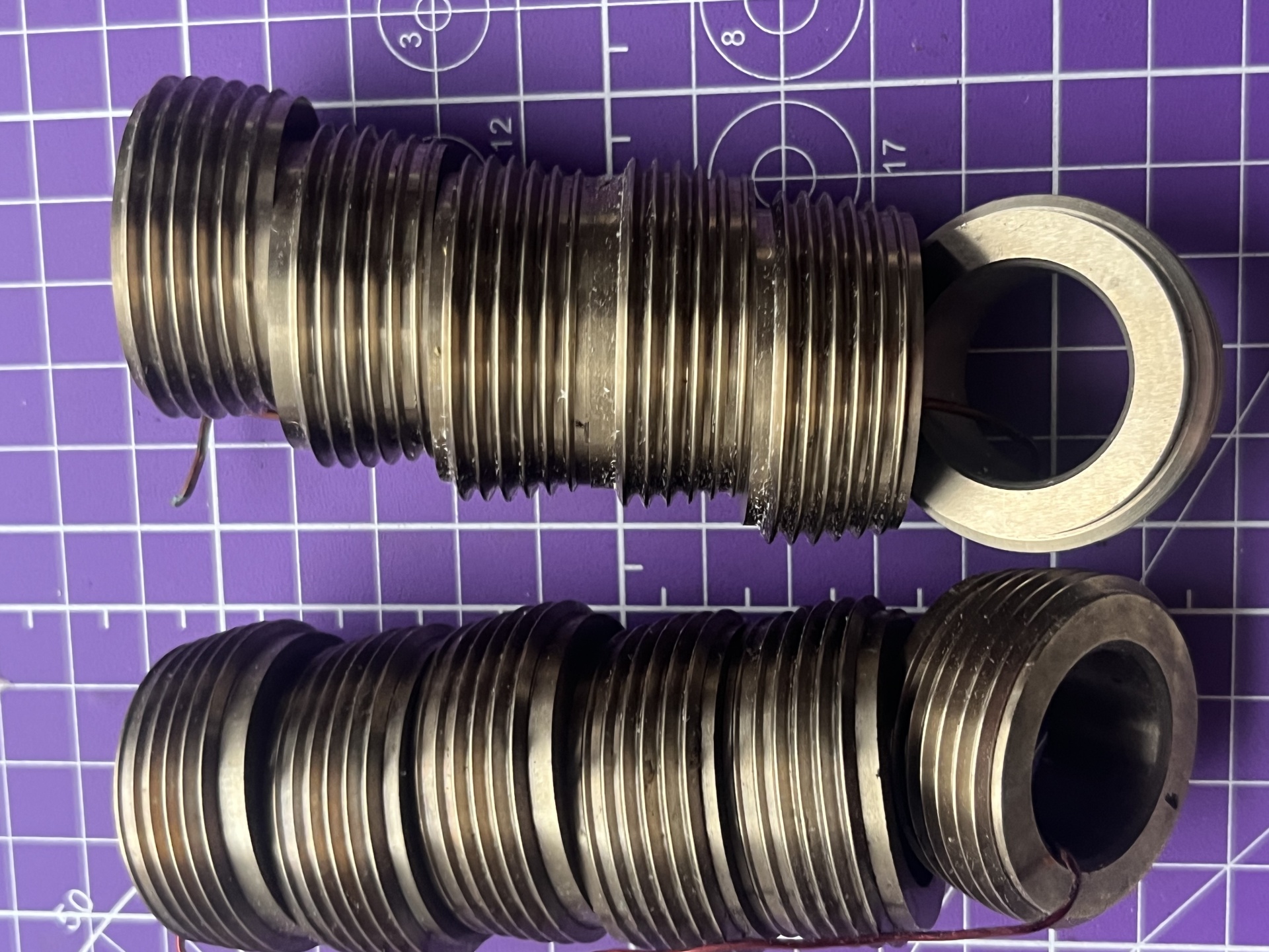 Универсальные накатные головки старого образца (ГН-1, ГН-2). Они конструктивно идентичны ВНГТ, но чаще применялись на метизных заводах для накатки резьбы на болтах и шпильках (хотя при установке роликов с трубным профилем, как на фото, отлично работают по трубам).