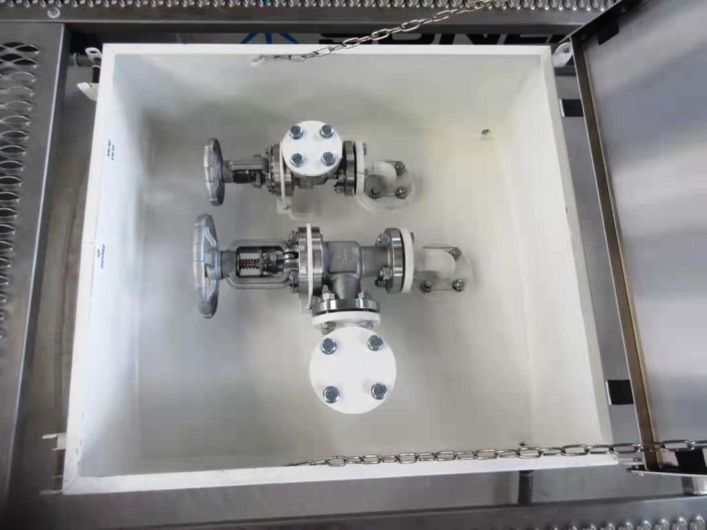| Защитные короба | Два короба с закрывающейся крышкой; В центральном находится люк и предохранительный клапан; Задняя разливочная коробка содержит соединение газовой фазы и соединение жидкой фазы. Дренажные трубы установлены на каждой стороне каждой верхней коробки. |