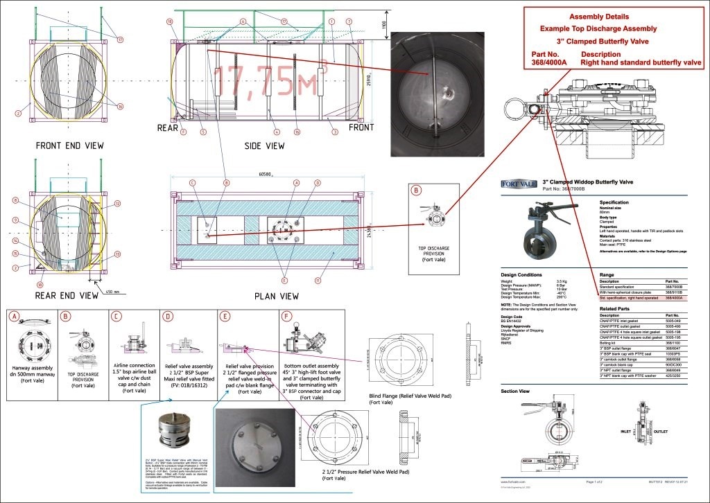 | Устройство нижнего налива (слива), мм | Fort Vale или GUARD, Ду80 мм (3"). Последовательно установленные внутренний и наружный клапаны с Ду 80 мм, выходной патрубок с резьбой 3"BSP и резьбовой крышкой |