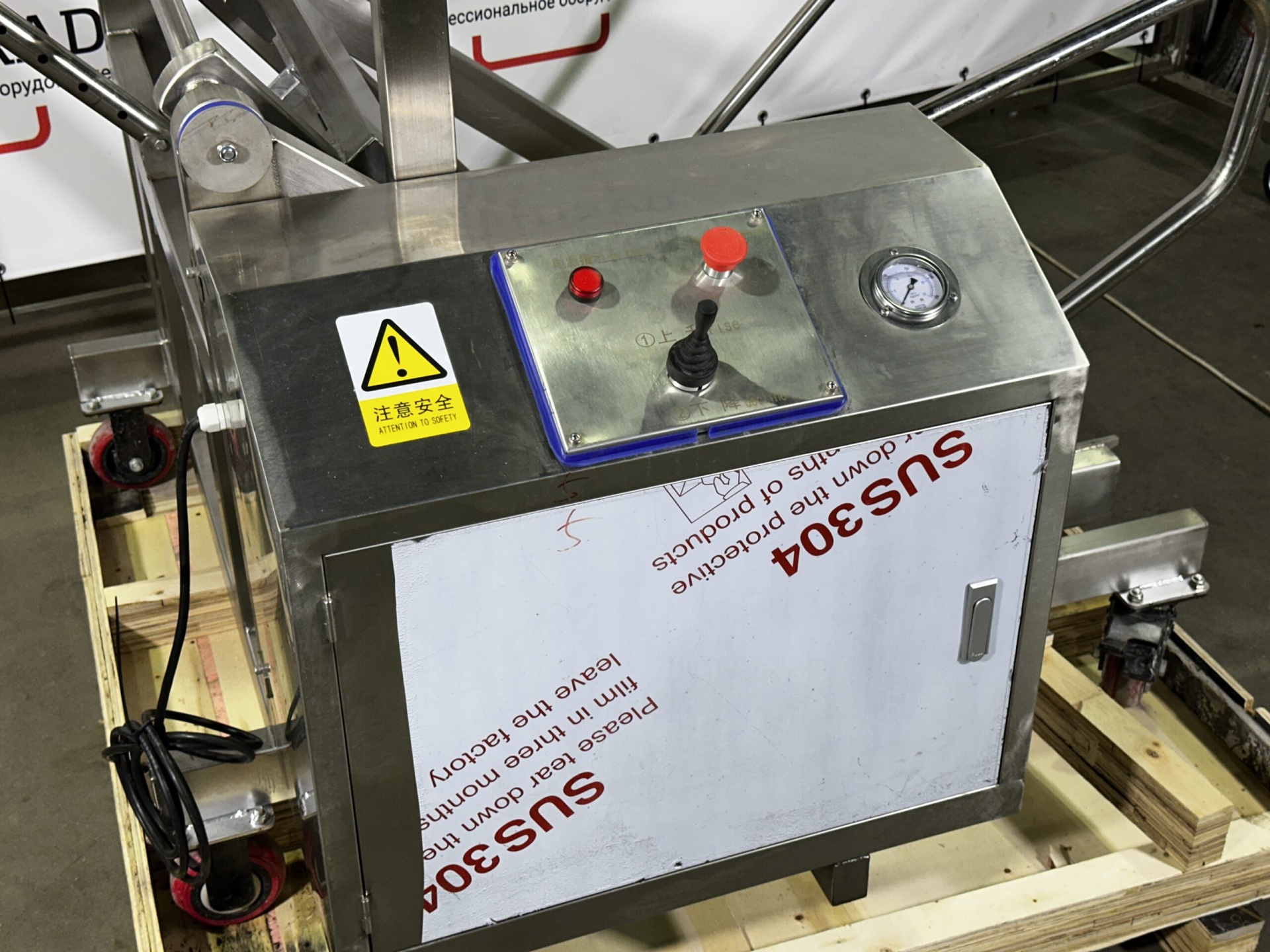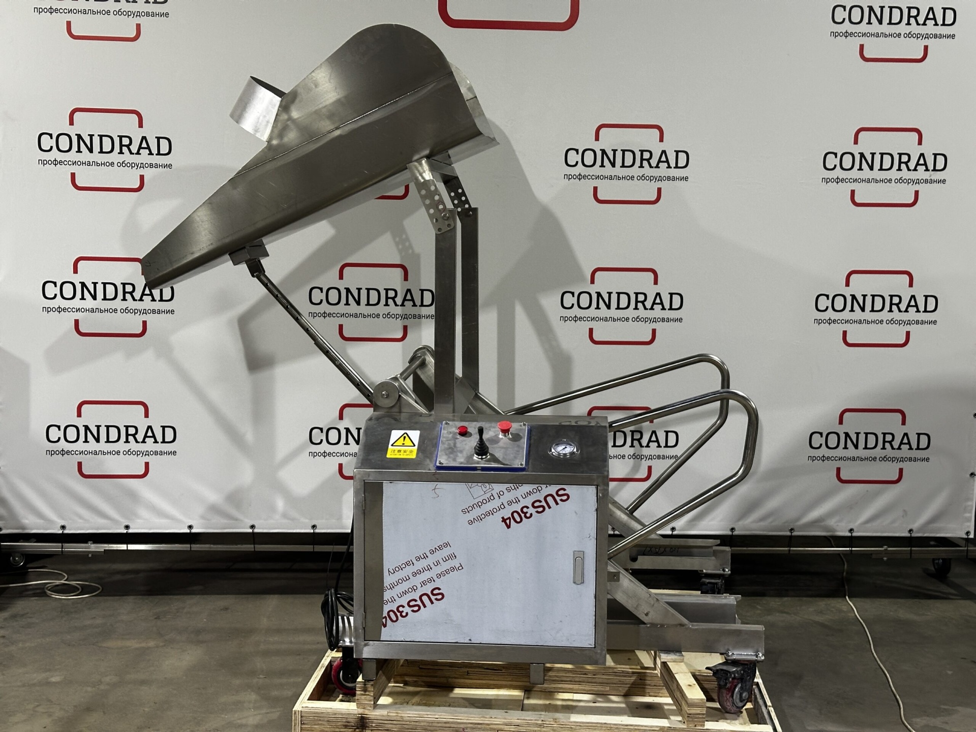 Подъемник предназначен для подъема и выгрузки технологических тележек (чебурашек) на 200 л с сырьем. Тележка с сырьем вкатывается в захват подъемника и фиксируется запорным механизмом.