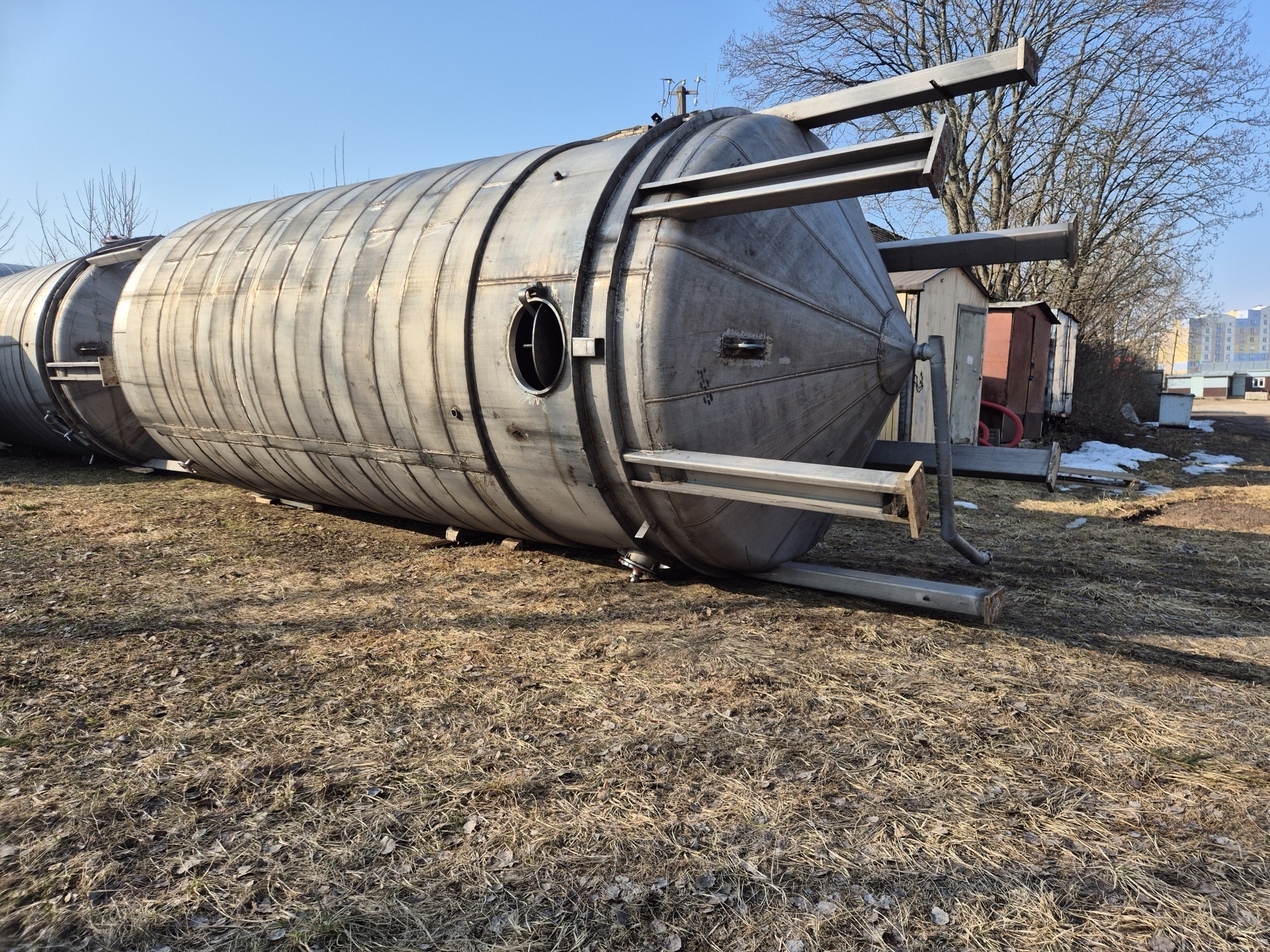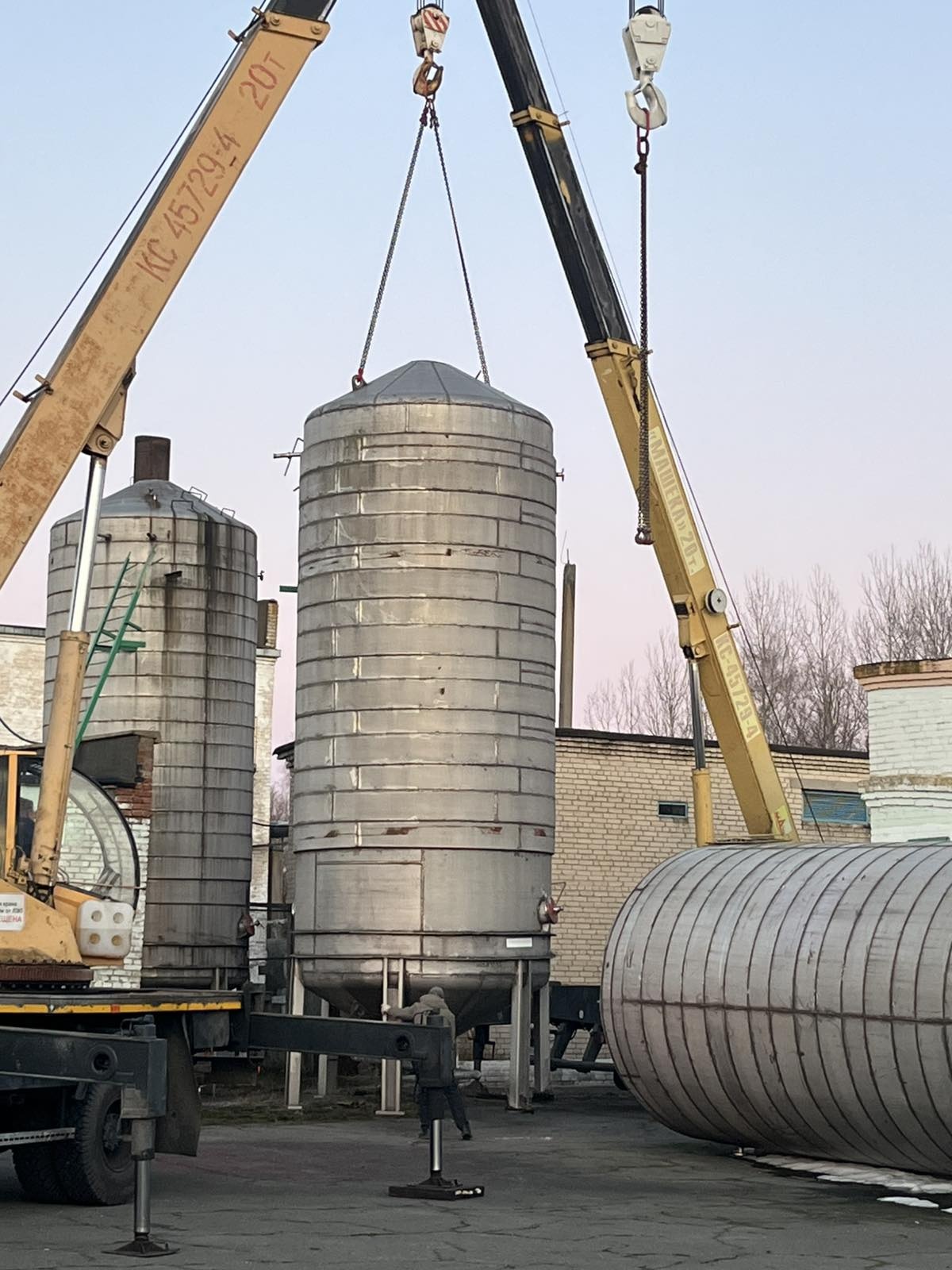 Резервуар из нержавеющей стали 50 кубов (12х18н10т), вертикального исполнения, из-под пищевых продуктов, с рубашкой нагрева и охлаждения. Мешалки отсутствую, люки под мешалки заглушены. Высота емкости 9 м, диаметр 3.2, вес 5 тн. В наличии 3 шт.