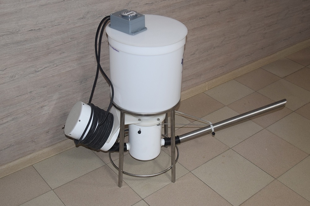 Кормораздатчик комплектуется подставкой, что позволяет осуществить простой монтаж на берегу водоёма.