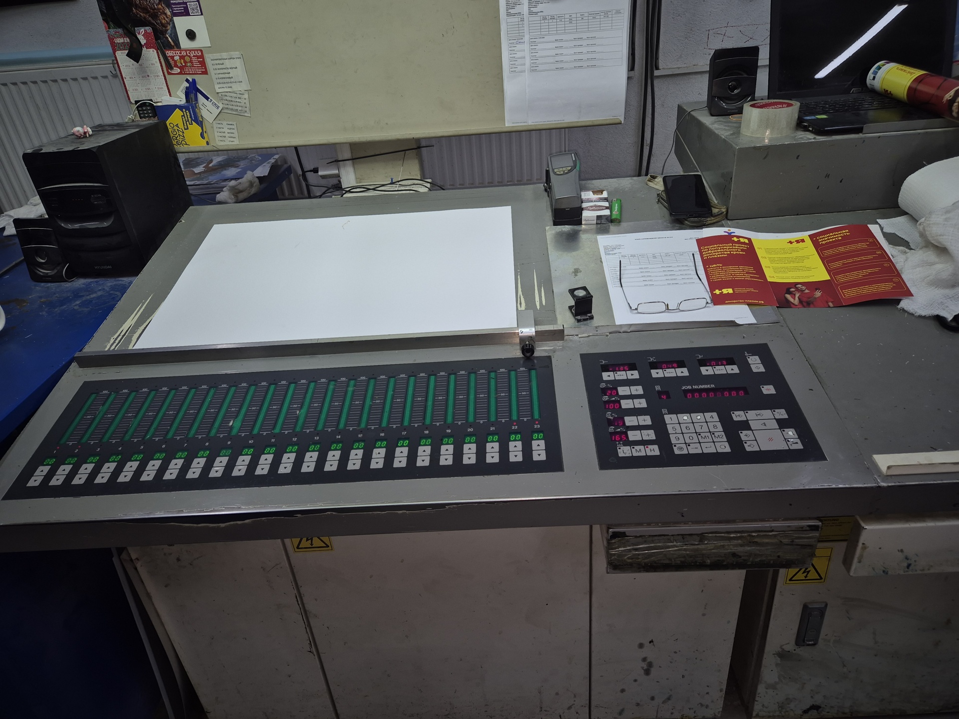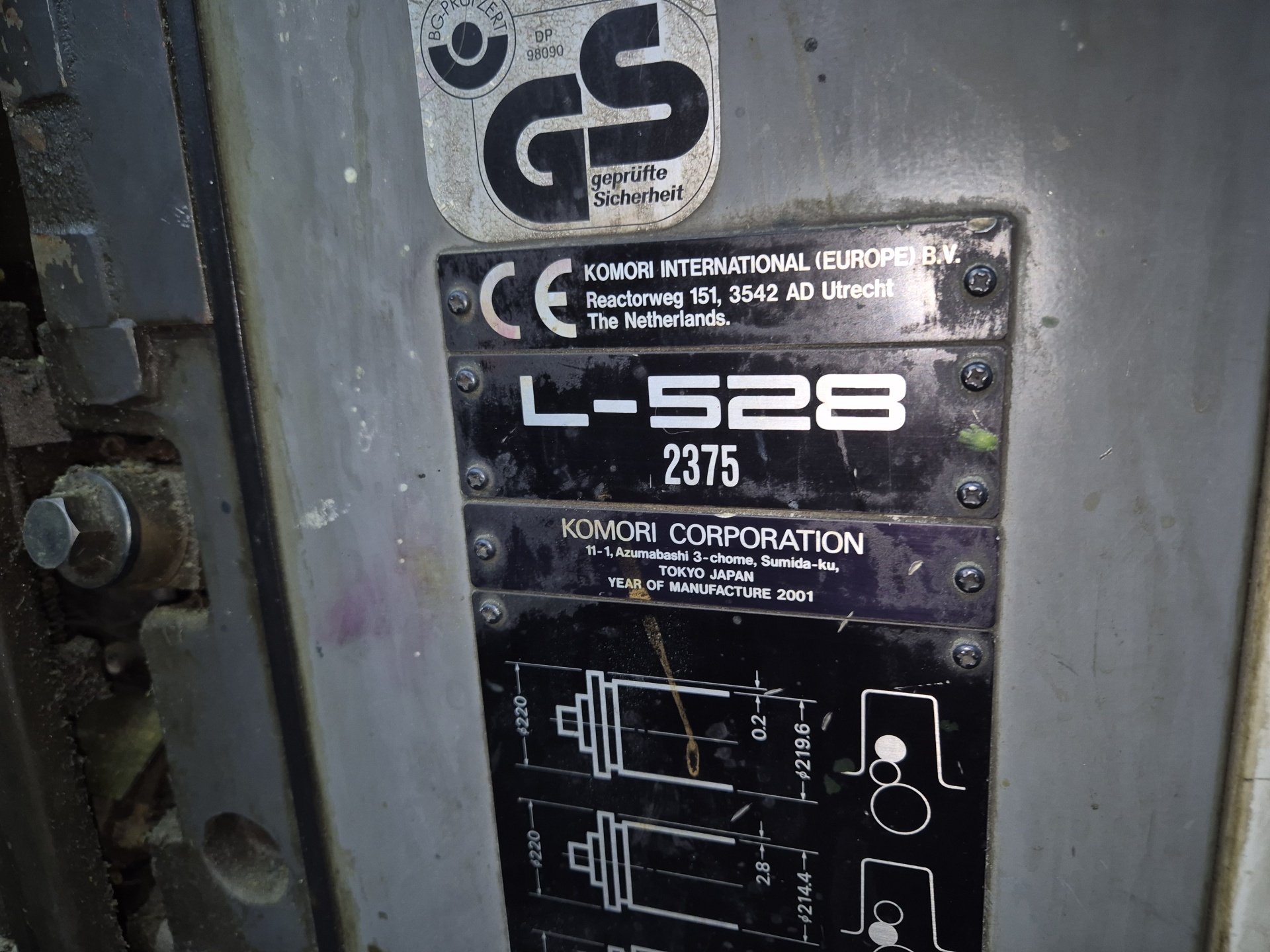 Komori lithrone 528, 2001 г.в., 5 секций, пробег точно неизвестен- более 200 млн. отт, приподнятая, установка форм полуавтомат, смывки офсетнные и печатные, с пульта приводки и краска. Спирт tehnotrans. В работе. Цена без НДС