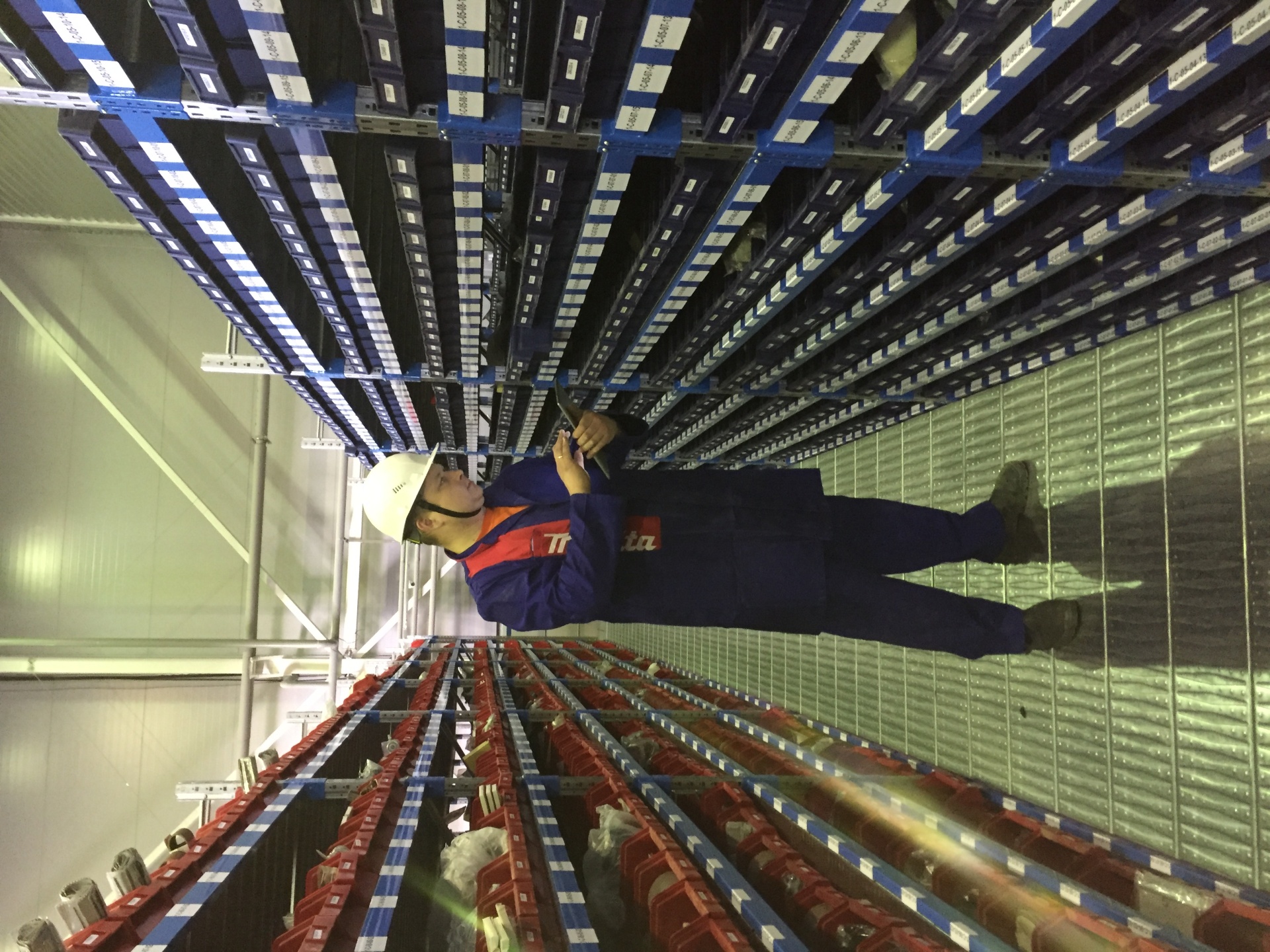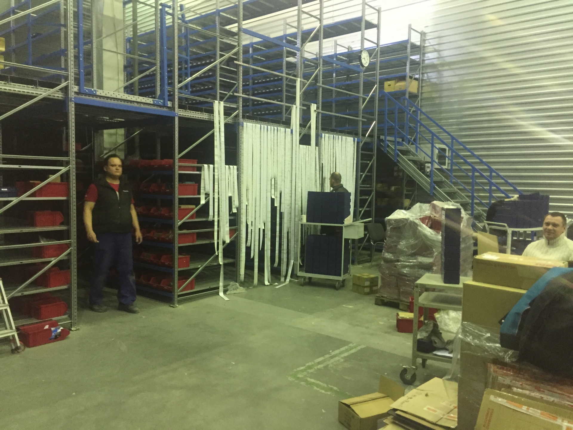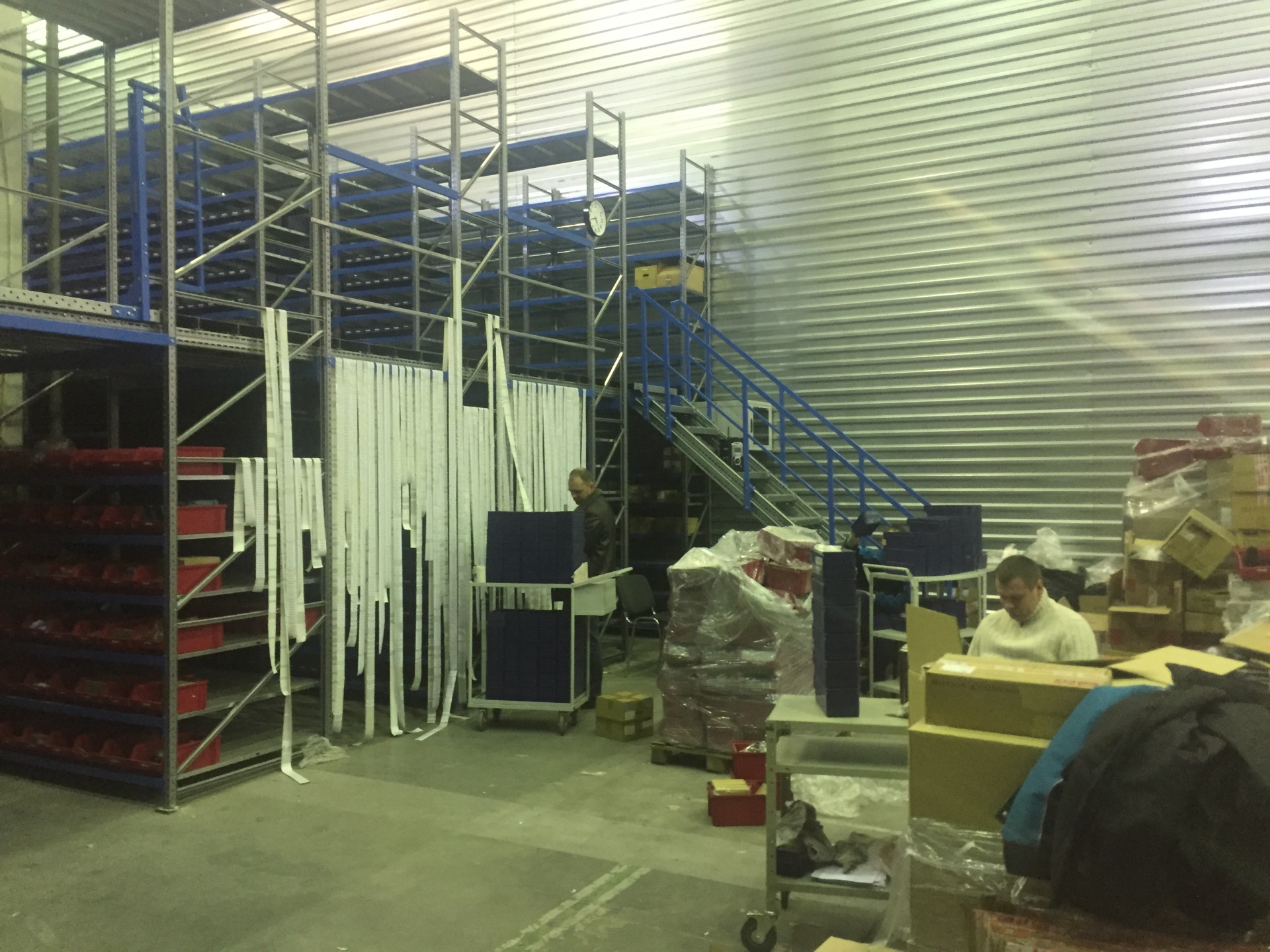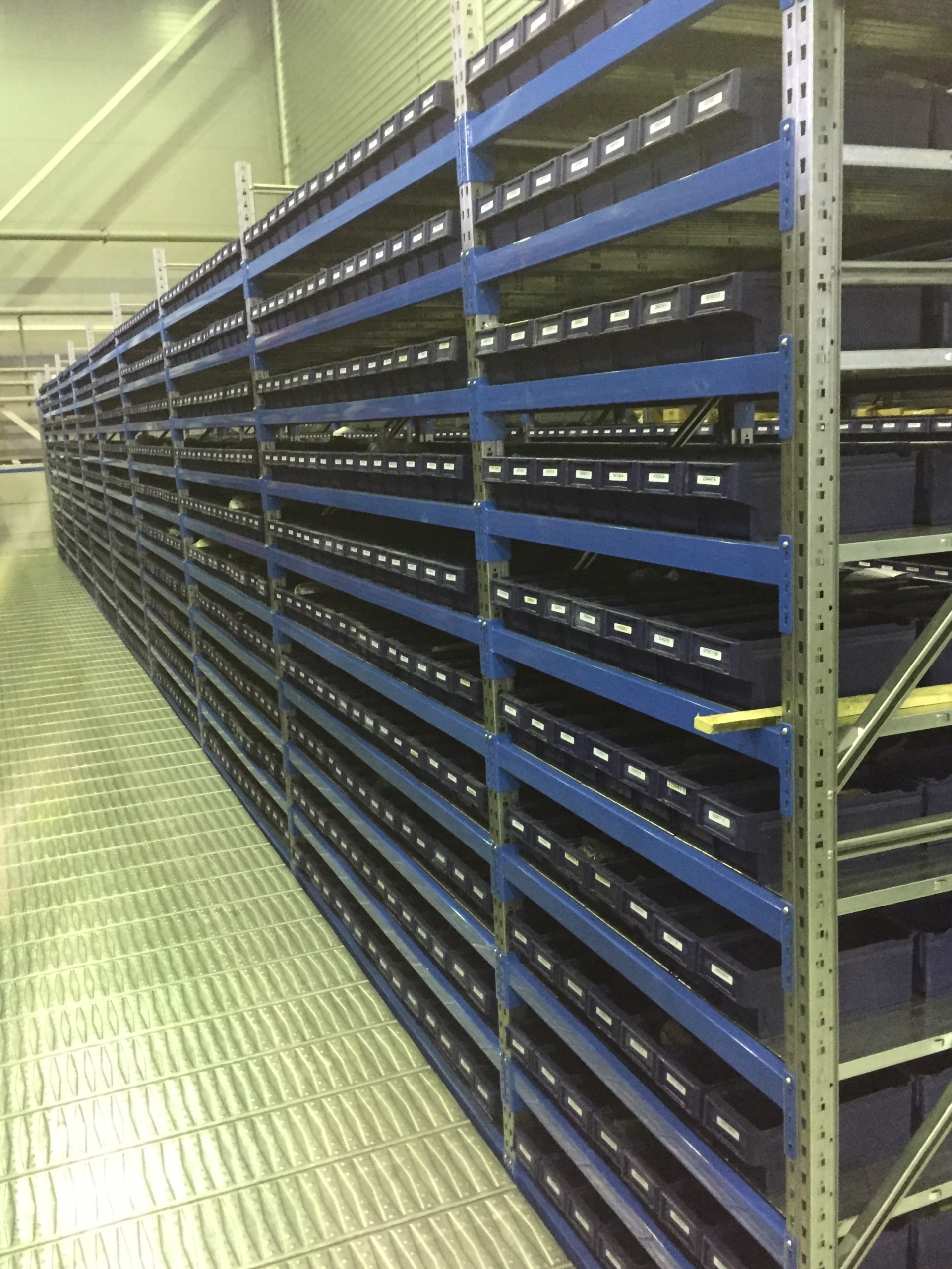 Складской стеллаж с пластиковыми ящиками на колесах