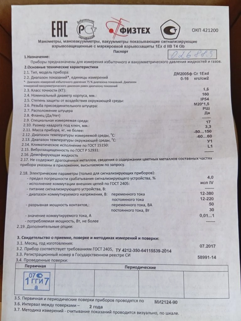 Манометр ДМ2005сг1Eхd исп.IV 0-16 кгс/см Физтех-2 шт.Цена 3800 руб.