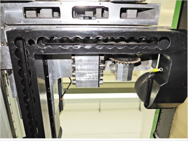 Общее количество шпинделей вертикальных + горизонтальных 50 шт: ДВА фрезерных узла: 4 оси и 3 оси по 12 кВт каждый Система автоматического удаления стружки Магазин инструмента на 33 позиций |