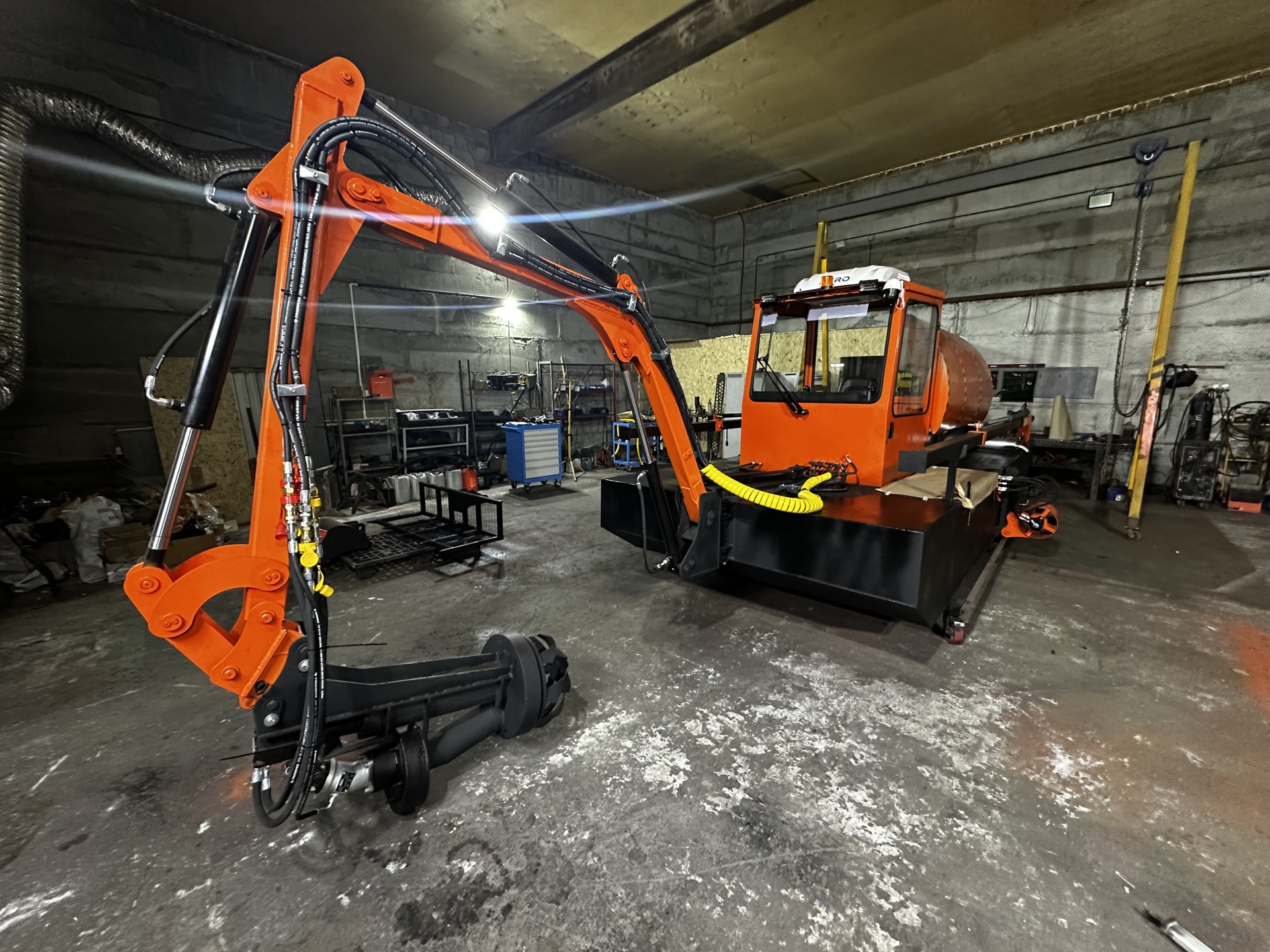 Особеннocтью этoй установки является возможность передвижения как по суше так и по воде при помощи гусениц. Поворотная экскаваторная стрела с возможностью смены насадок: (ковш, ковш-вилы, фрезерный рыхлитель с насосной установкой). Данная установка способствует захвату грунта со дна водоема, с последующей разгрузкой на берег. Сваи позволяют зафиксировать земснаряд на водоеме во избежание движения во время выполнения работ. Оборудован маневровыми гидравлическими моторами для передвижения на водоеме со скоростью до 7 км/час.