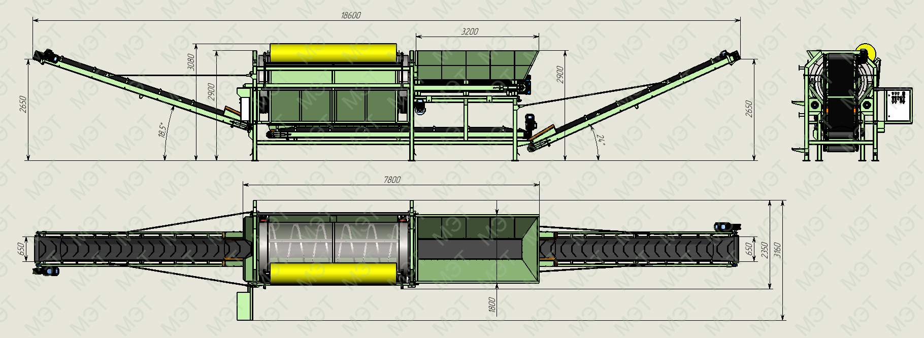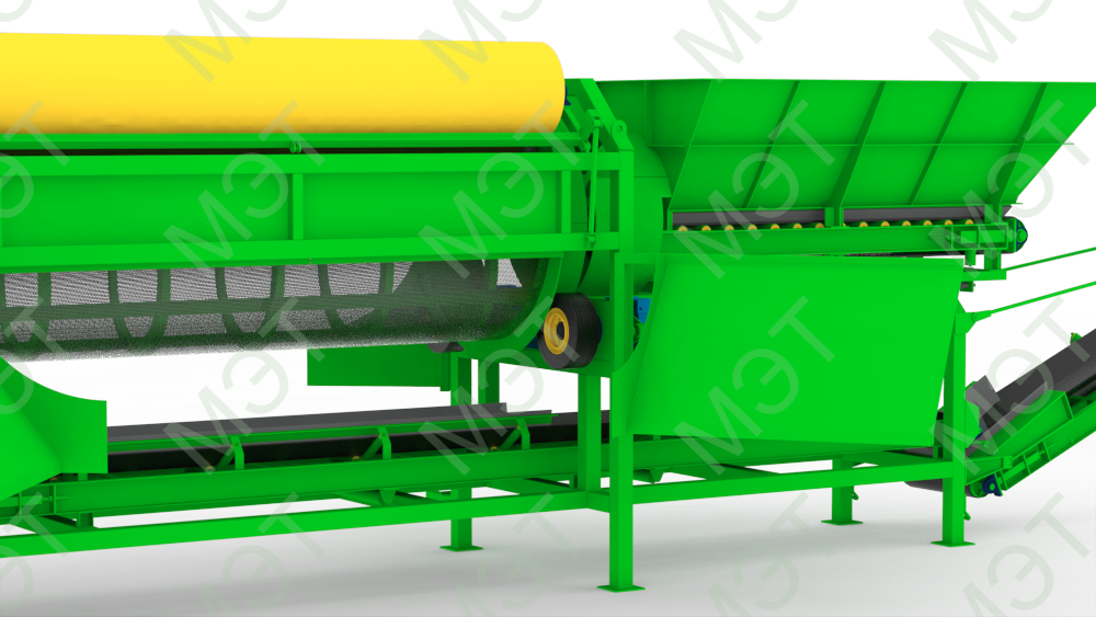 - Длина просеивающей части барабана 3 350 мм. (2 сита).