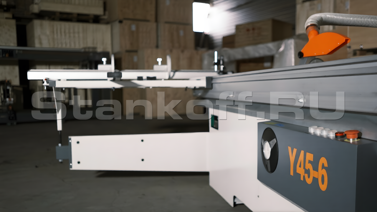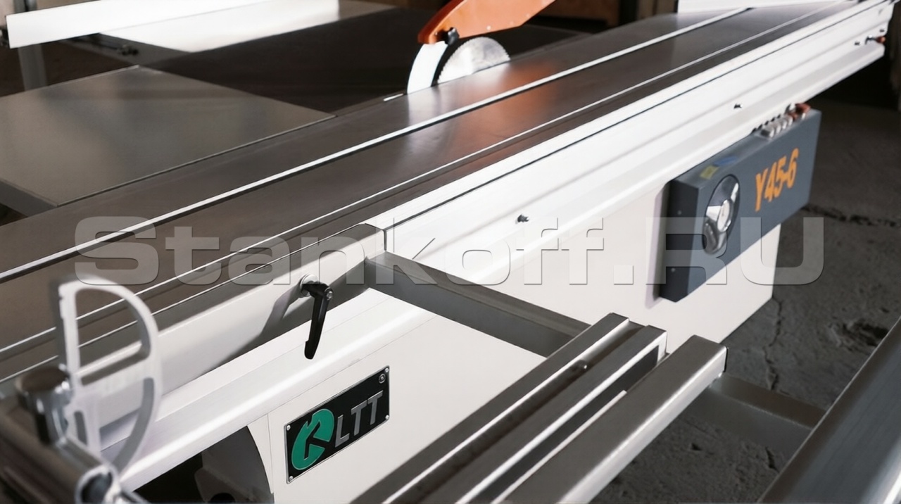 Станок оснащён механизмом наклона пильного узла до 45°. Механическая регулировка и индикация угла расположены в зоне оператора, обеспечивая быструю и точную настройку.