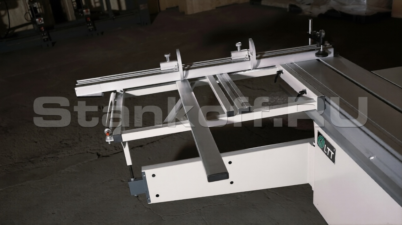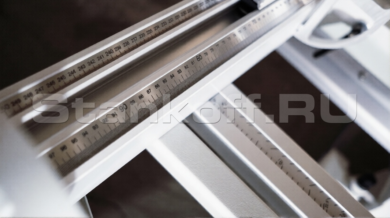 В стандартную комплектацию станка включен упор для раскроя заготовок не под прямым углом. Устанавливается на каретку и настраивается с помощью специальной шкалы.