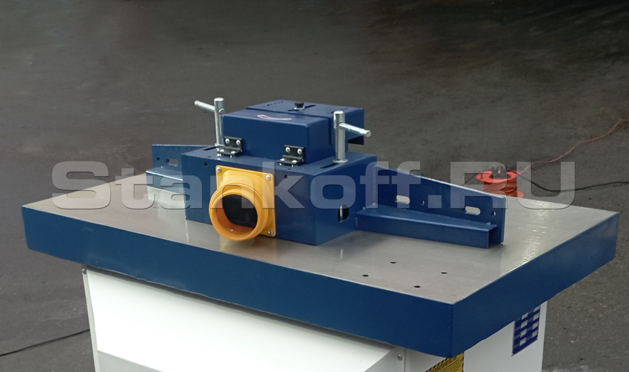 - Защитный кожух фрезы оснащён направляющими линейками и патрубком для подключения аспирации.