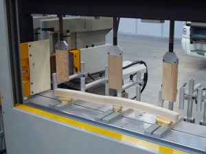 На станине также установлены регулируемые выравнивающие пластины. - Алюминиевая структура стола имеет ребра жесткости для того, чтобы противостоять давлению прижимов. Перемещение подвижного стола осуществляется по линейным направляющим на подшипниках скольжения. Точность хода стола – максимум 0,03 мм в максимальных точках прогиба. Вдоль оси стола сделаны отверстия для фиксации шаблонов. Эти отверстия также используются как нулевые точки для определения положения рабочих групп станка. Это дает возможность оператору правильно уложить заготовки на поддерживающие суппорты. Также копировально-фрезерный станок укомплектован регулируемыми упорами с линейками для облегчения позиционирования криволинейных деталей.