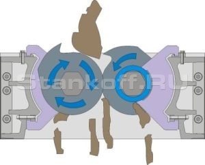 Материал, подлежащий измельчению, засыпается в загрузочный бункер. Валы с ножами совершают встречное движение и тем самым происходит захват материала, проходя через ножи материал подвергается резке, либо разрушению и дальше измельченный материал выпадает из рабочей зоны для дальнейшей утилизации.