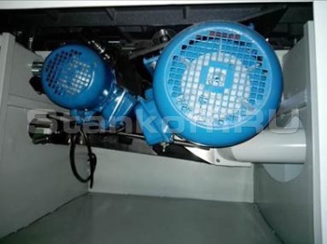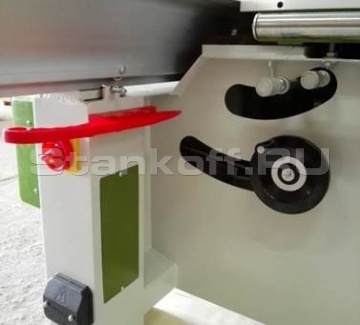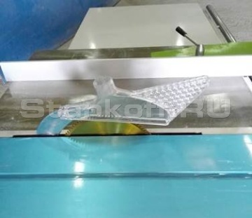 - Пильный механизм включает в себя два режущих узла основную пилу и подрезную пилу. Подрезная пила имеет попутное вращения относительно подачи заготовки и за счет предварительного реза позволяет раскраивать ламинированные листы ДСП без появления сколов.
