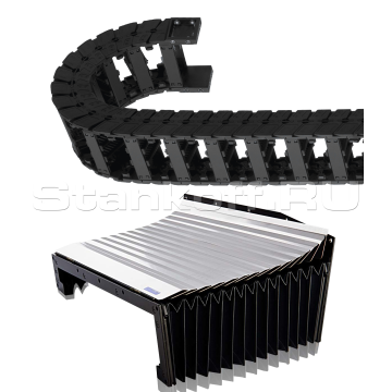 Направляющие и косозубые рейки станка закрыты гофрозащитными кожухами с металлическими накладками. Обычно используется только тканевая гофра, которая со временем прогорает и перестает выполнять грязезащитную функцию. Металлические накладки служат для предотвращения попадания окалины, искр, стружки на тканевую основу. Благодаря этому металлическому панцирю многократно увеличивается срок службы гофрированных кожухов.Все кабели уложены в гибкие кабельные цепи.