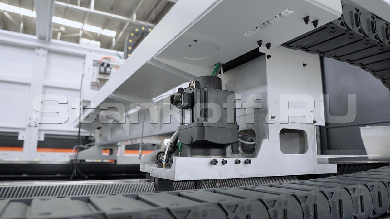 Направляющие и косозубые рейки станка закрыты гофрозащитными кожухами с металлическими накладками. Обычно используется только тканевая гофра, которая со временем прогорает и перестает выполнять грязезащитную функцию. Металлические накладки служат для предотвращения попадания окалины, искр, стружки на тканевую основу. Благодаря этому металлическому панцирю многократно увеличивается срок службы гофрированных кожухов.Все кабели уложены в гибкие кабельные цепи.